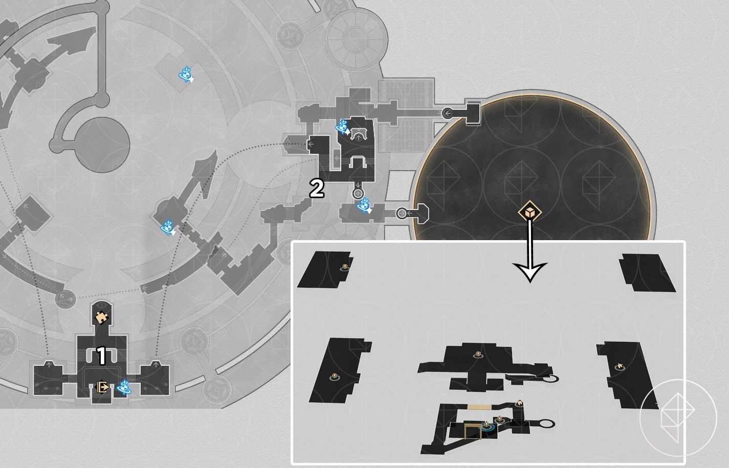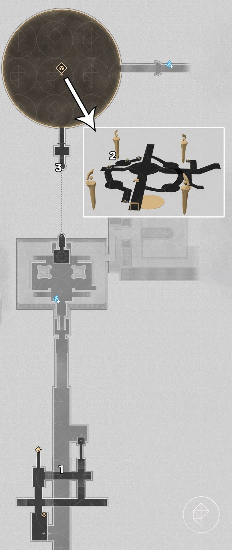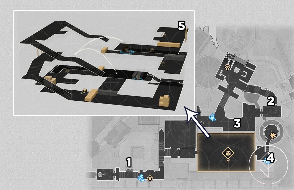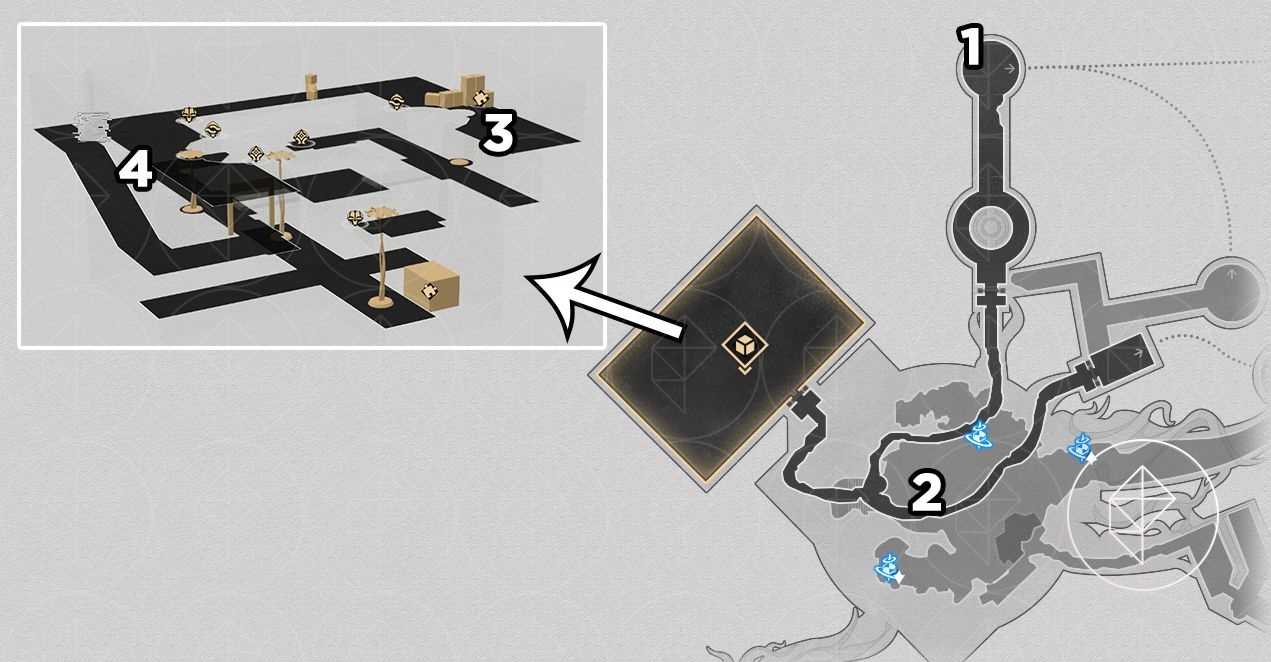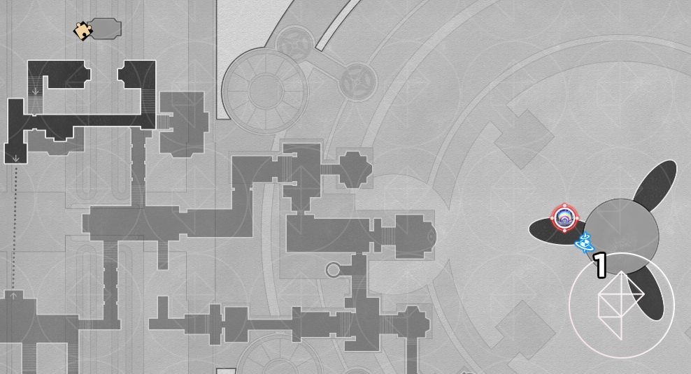 - On the bottom-most floor of the 3D room near four artifacts.