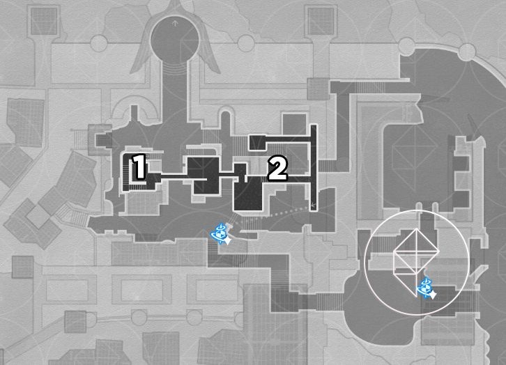 - Over broken vases in a lift room reached by walking east from the western fountain square.