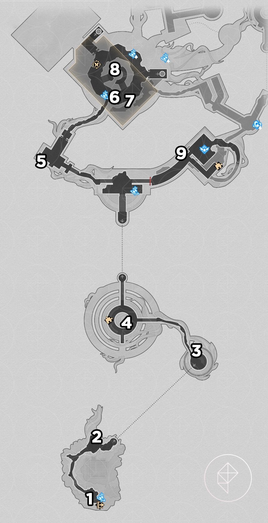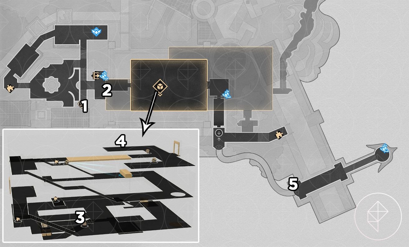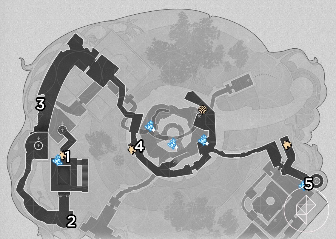 There are 20 red-orange beetle nymphs here. Rewards include Stellar Jade, Celestial Ambrosia, and the key item “Portentous Goldwoven: Bloodbathed Battlefront.” After collecting them, follow the key item hint and stand in the center of the round 3D room on B1 at dawn to trigger the area puzzle. Answer “Four warriors” when prompted to get the chest and the achievement “Chirping Secret: Blemish of Light.”
