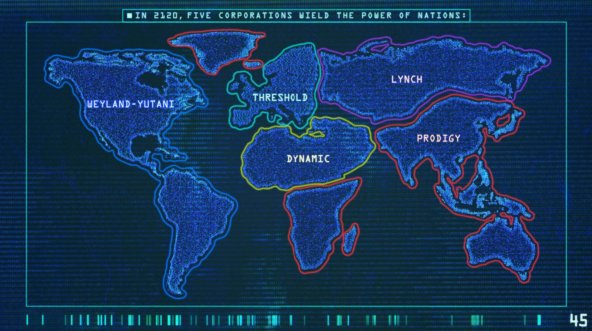 The show’s press materials include a map showing how five fictional companies divide the world by 2120. Some names on that map, such as Threshold and Lynch, had not previously appeared in Alien fiction.