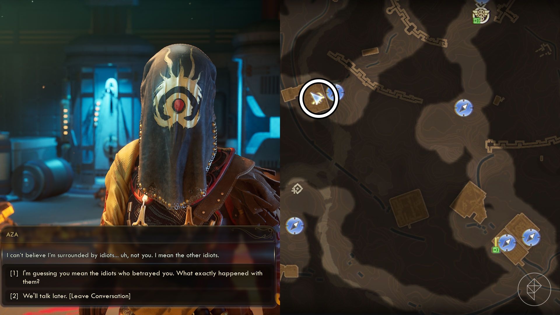 Traits while in party: A Chaotic Purpose (ability charges faster and Aza has two charges) and Hidden in Palin-Sight (higher bounty threshold for factions to consider you an Outlaw if their reputation with you is neutral or better).