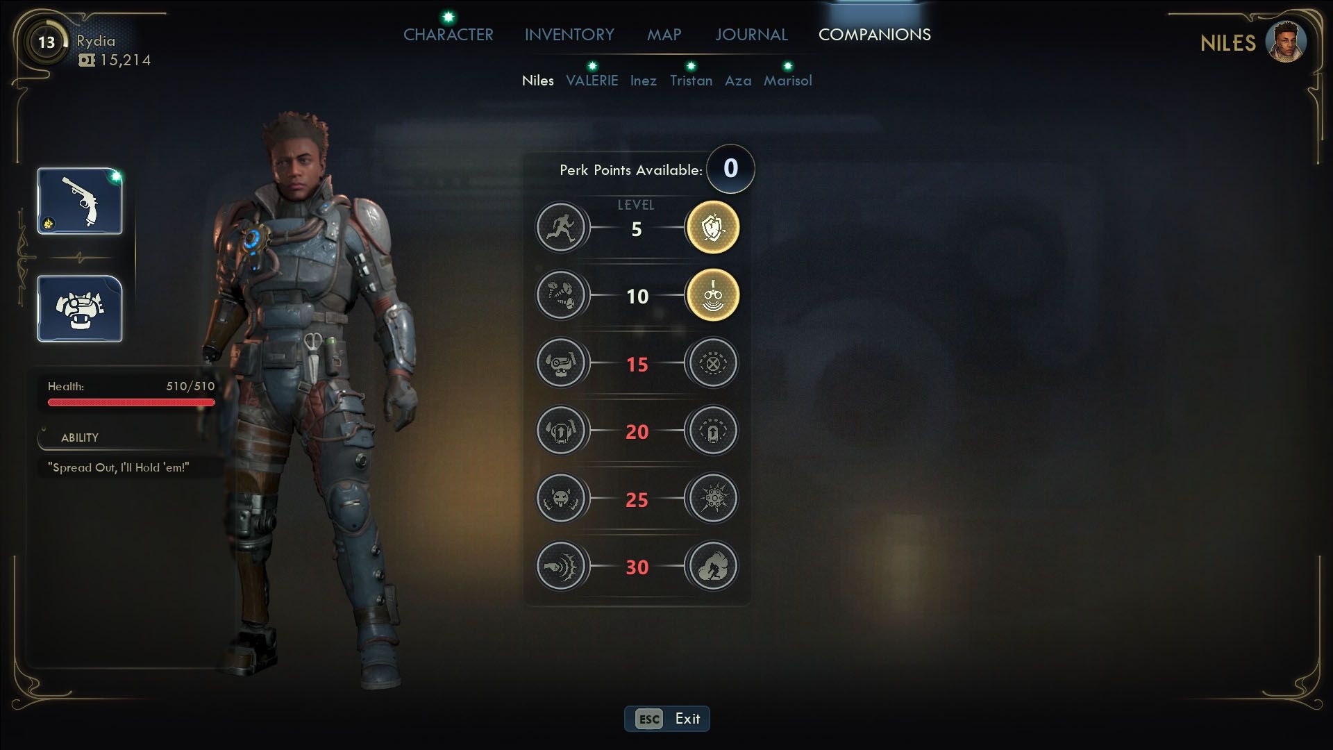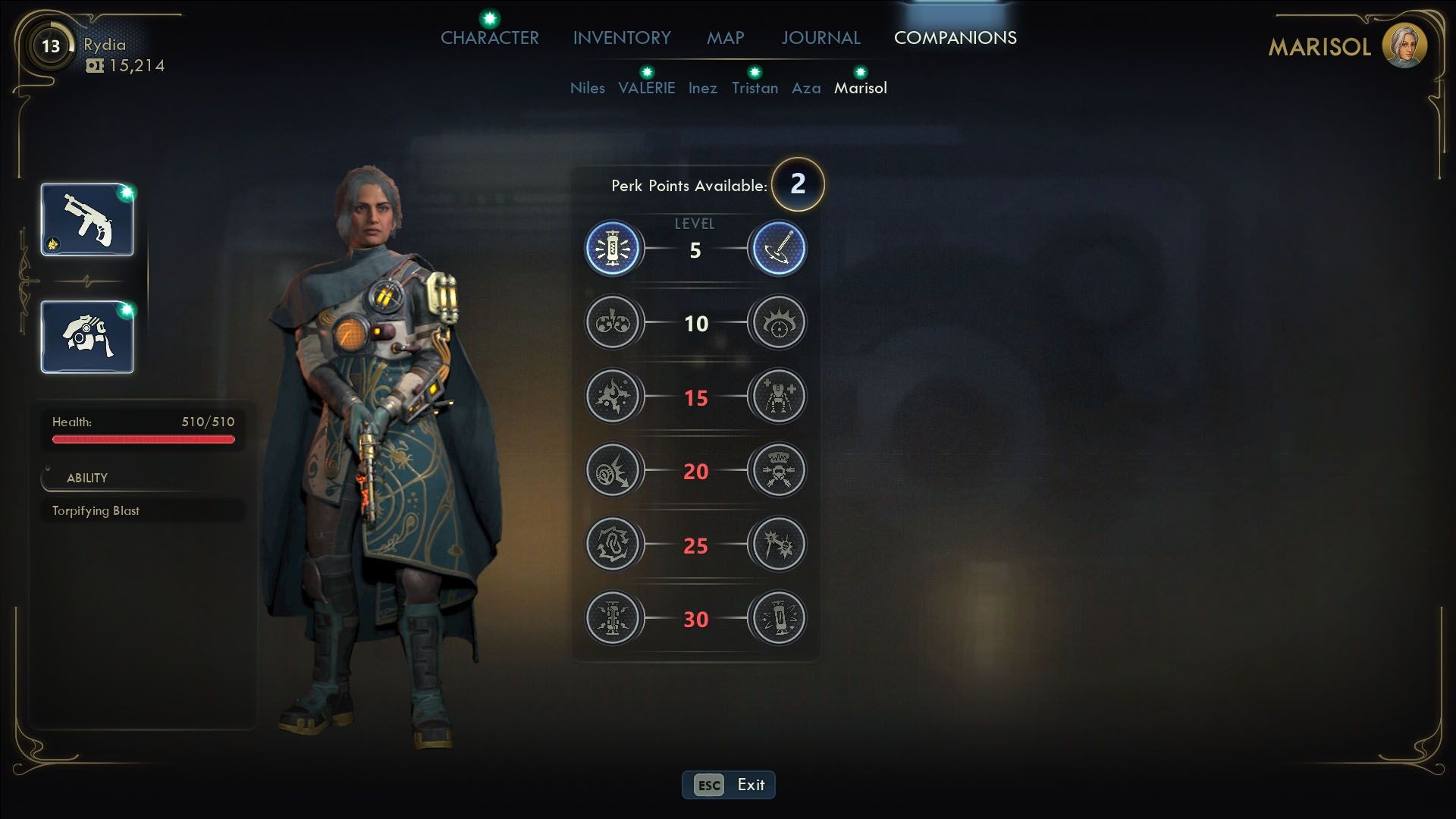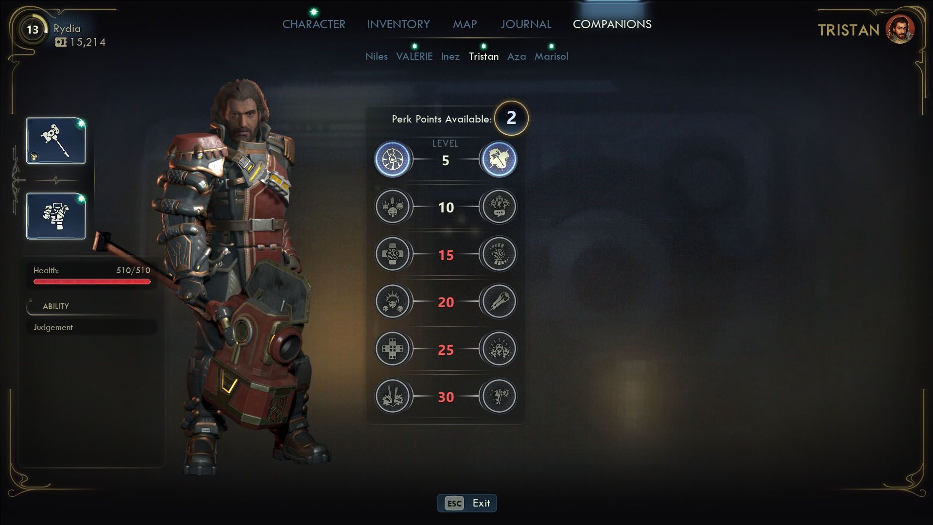Traits while in party: Supreme Arbiter Hammer (his hammer can function as a grenade launcher) and Observant Adjudicator (25% chance to reveal hidden objects when you can’t reveal them yourself).