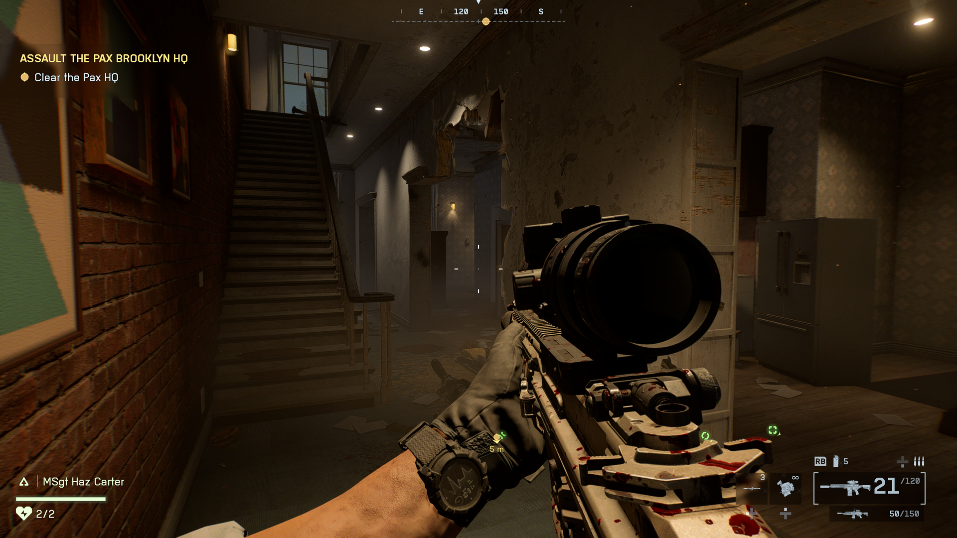 In the No Sleep mission, troops search Brooklyn Heights townhouses for a PAX Armata hideout. The mission presents combat in tight interiors — such as bathrooms and bedrooms — and in vertical layouts around townhouses. The game shows military vehicles and drones operating in public Brooklyn locations during the sequence.