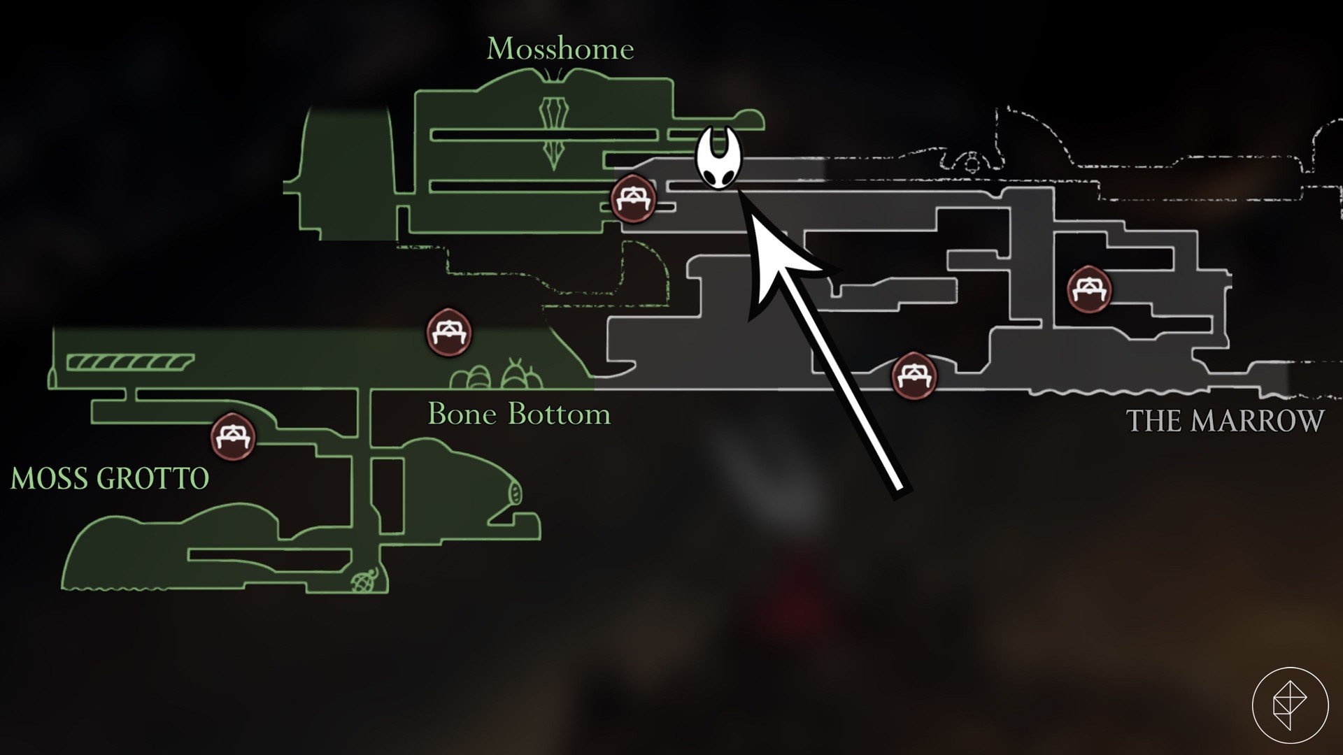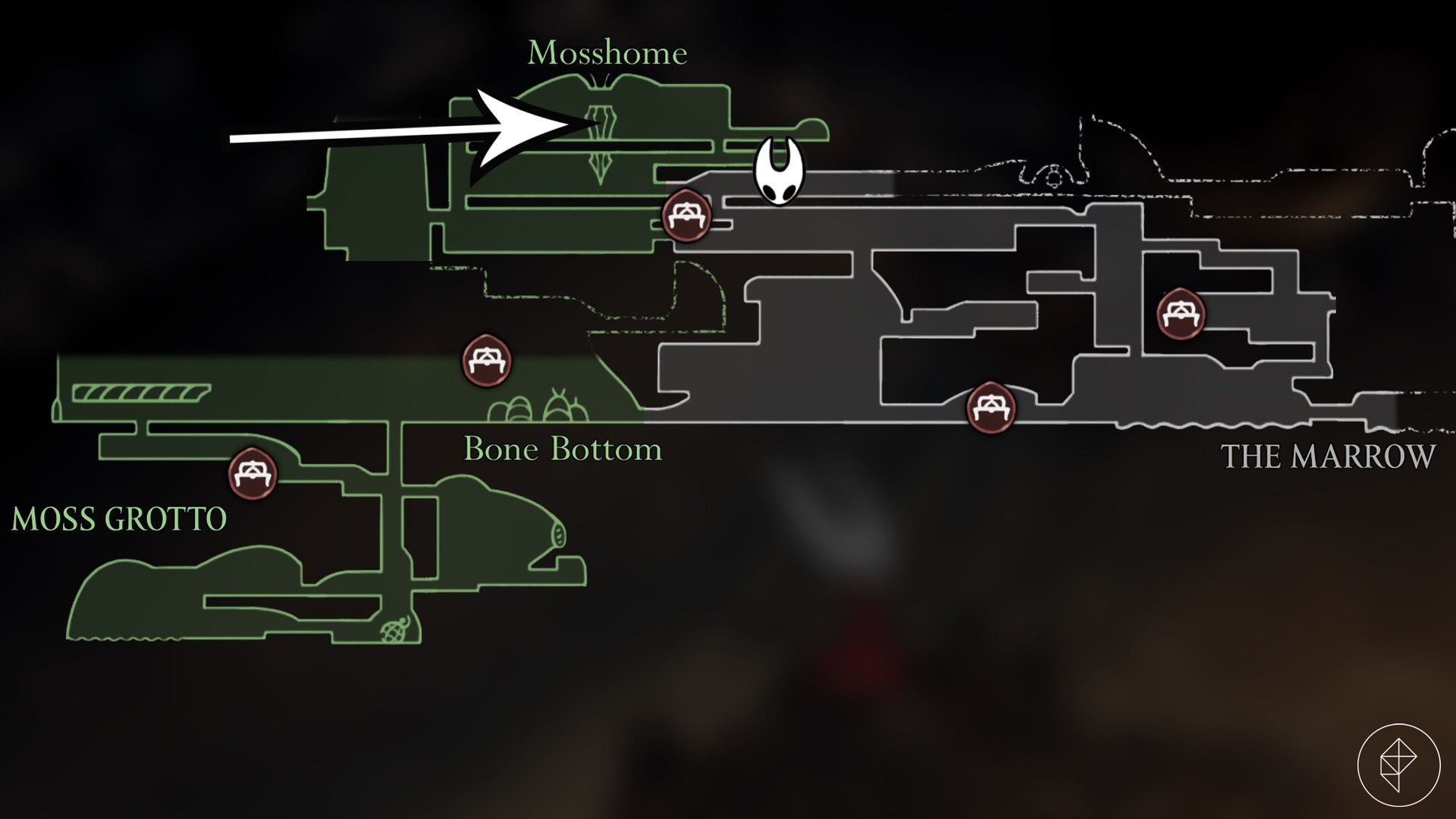 First, get from Moss Grotto to Bone Bottom, then head east into The Marrow. When you reach a large open area with platforms (including disappearing ones), jump up and go left. Keep left until you find Shakra, the singing bug who sells maps. From there, jump to the slightly higher platform on her left and go upward.
