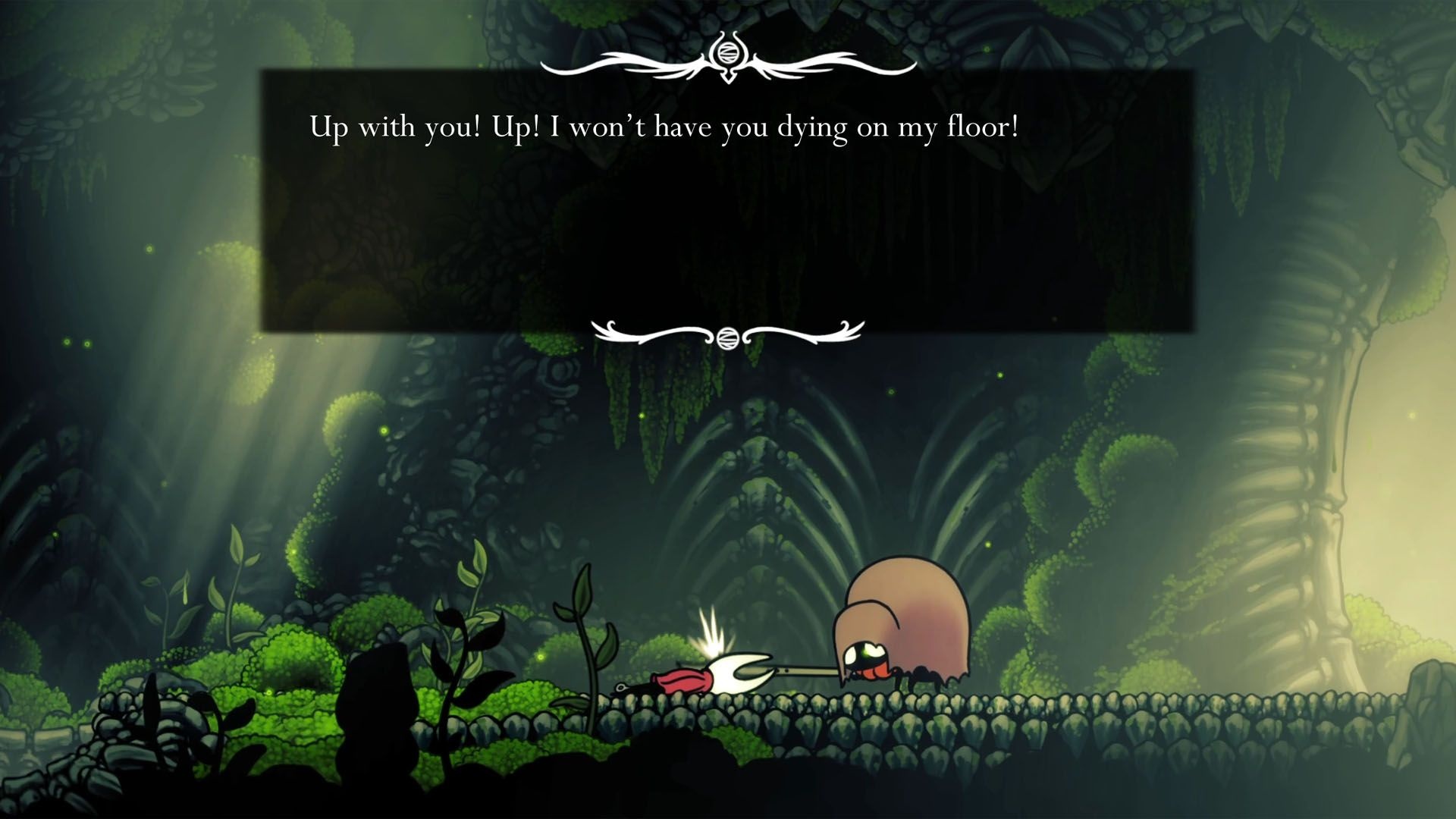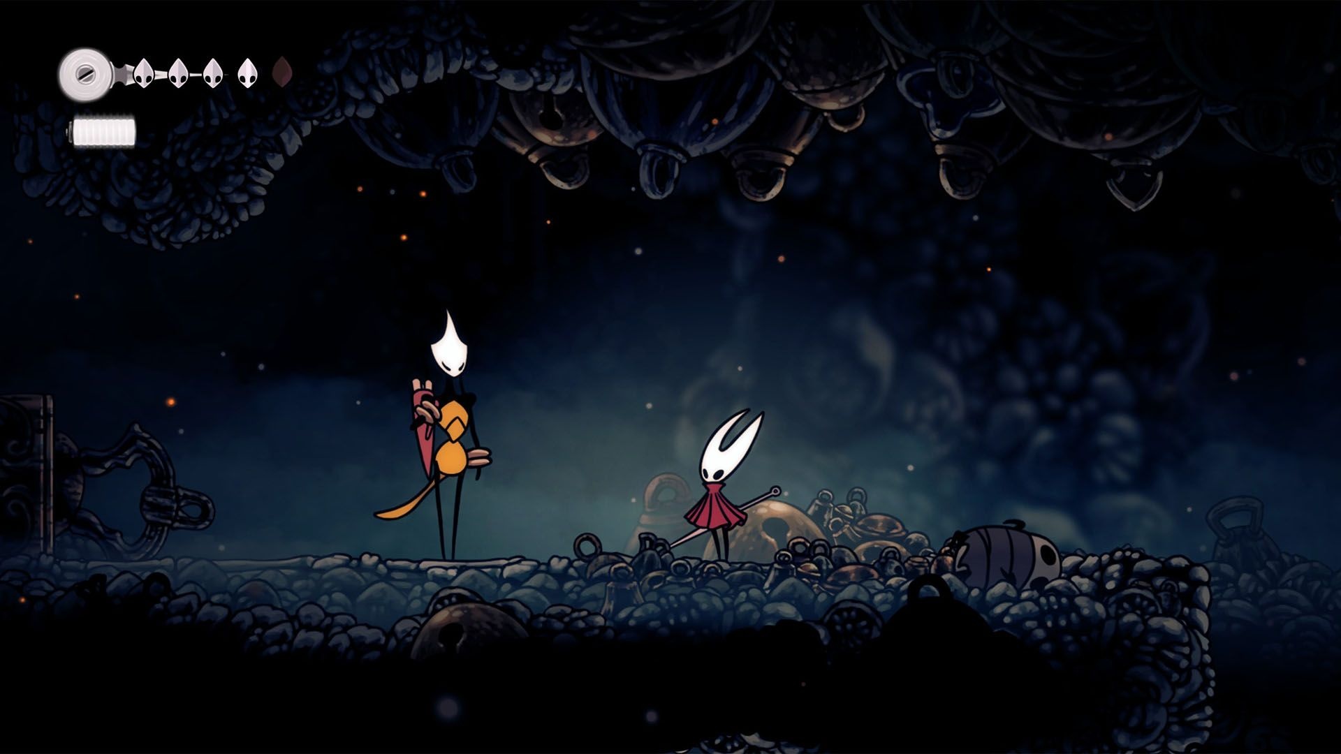 After escaping your cage in Moss Grotto, make your way up and out. You’ll face the boss Moss Mother early on. Defeat her, continue upward, and you will arrive at Bone Bottom village where you can rest on a bench and speak with NPC pilgrims.