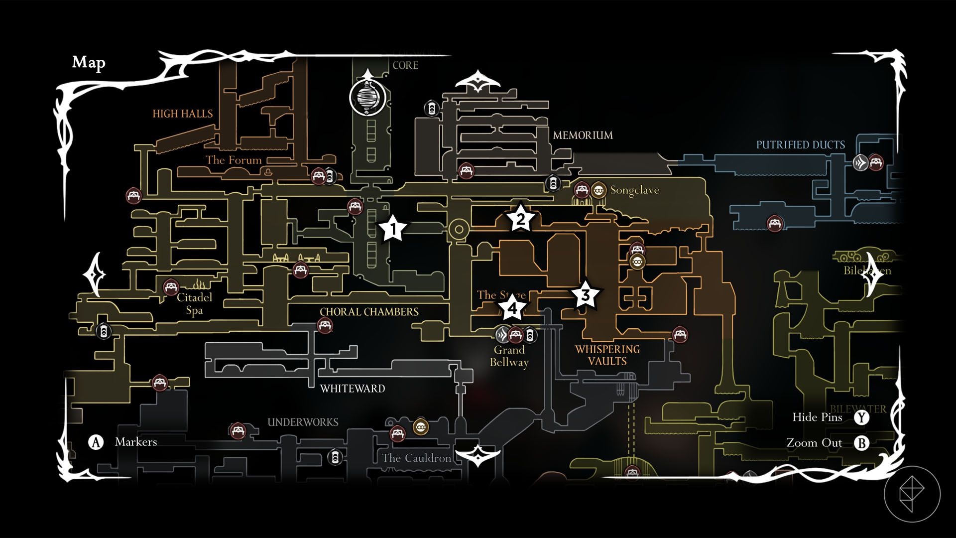 From the Grand Gate you can reach Choral Chambers by either taking scale platforms and breaking a wall (quick route) or using the elevator and Underworks (longer route). The long route yields more materials and a map, so it’s recommended for completeness.