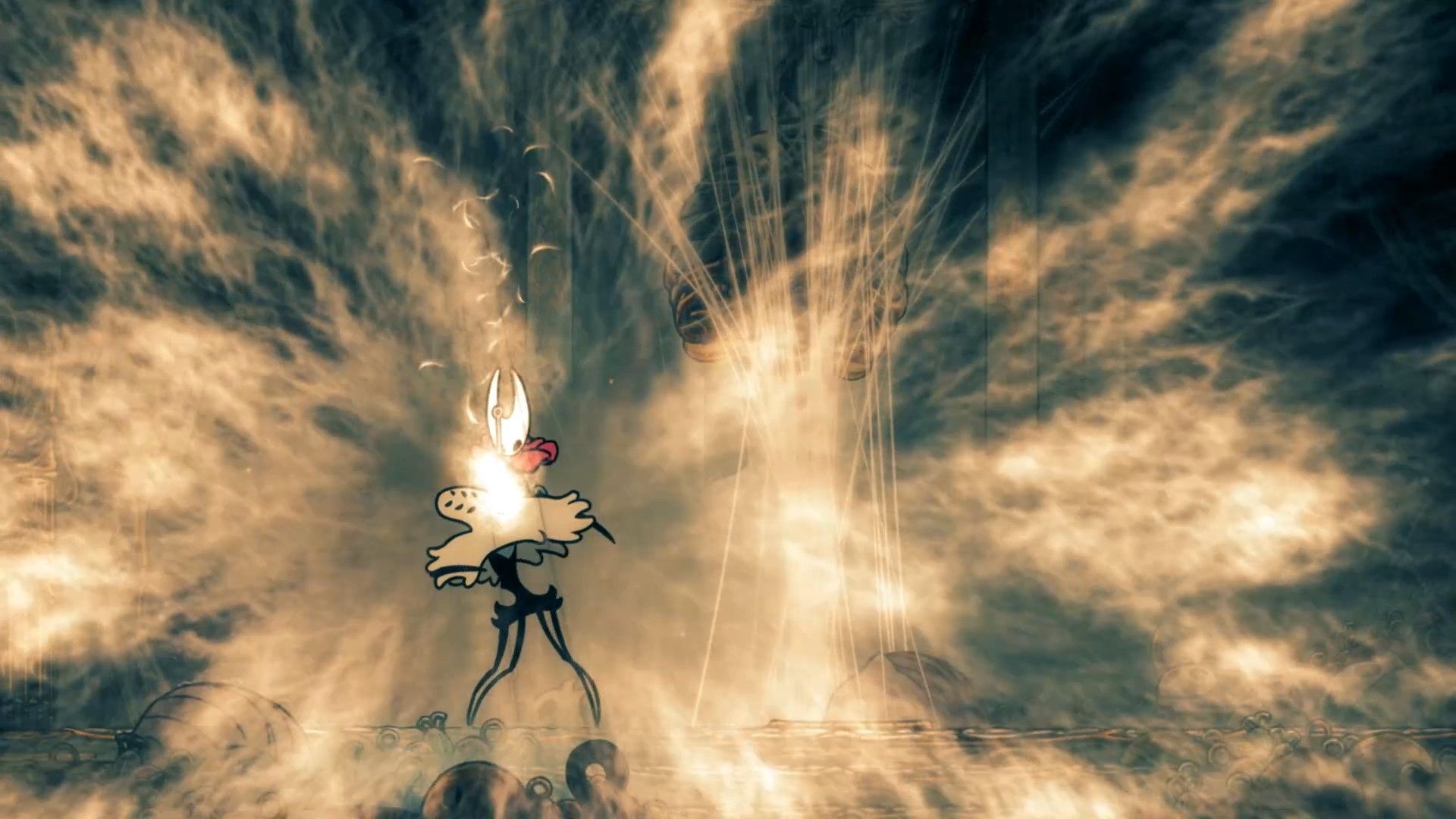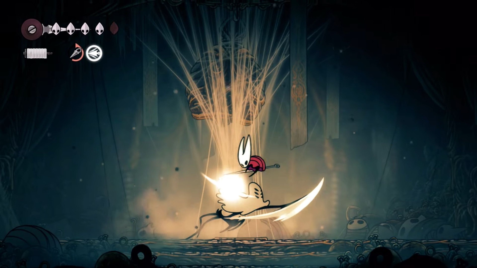 Widow uses a range of bell-based attacks and a melee scuttling slash. She has two phases: the first is varied and measured, while the second is faster and more aggressive. Importantly, her bells can be deflected by attacking them, so you can parry projectiles if you can’t dodge.