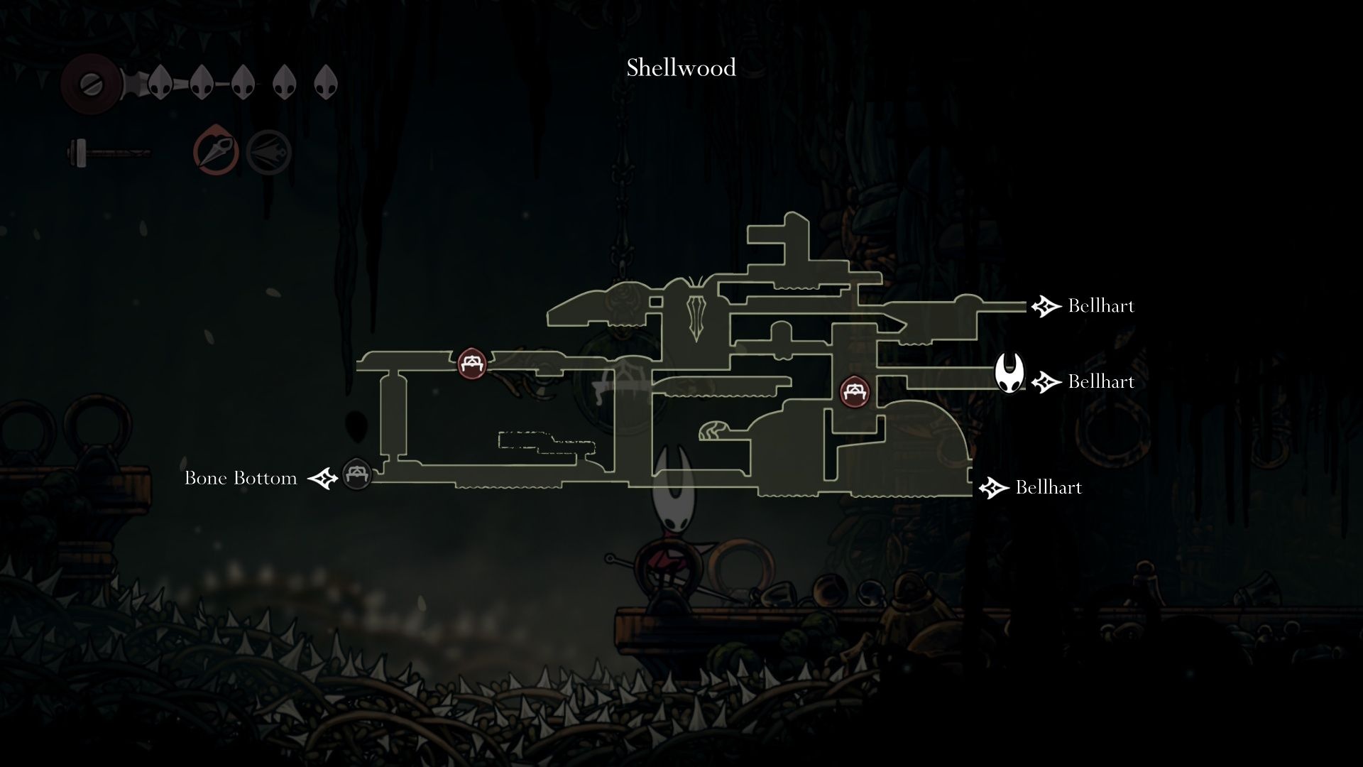 There’s a destructible bell wall on the left near the bottom that leads back into Shellwood. If you go through it, you’ll hit a short platforming segment and a bench near the first Shellwood checkpoint. Therefore, that route is a reliable runback; rest at the bench before you re-enter the tunnels and open the trap door that leads to Widow.