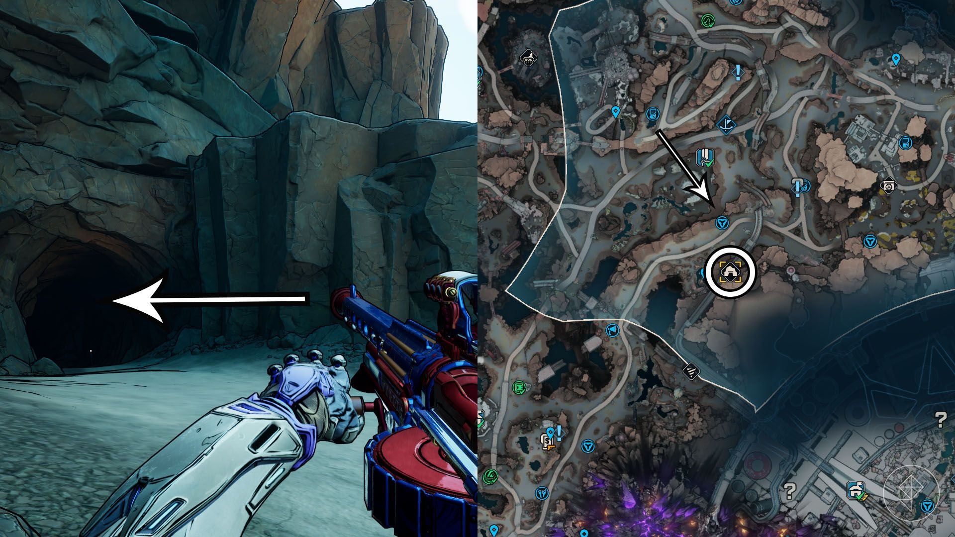 To reach The Claim, teleport to Zadra’s Backup Plan in Dissected Plateau. Then leave the room via the door beside the fast travel station and follow the cave path to the right, heading north. The glowing fake wall entrance is on your right.