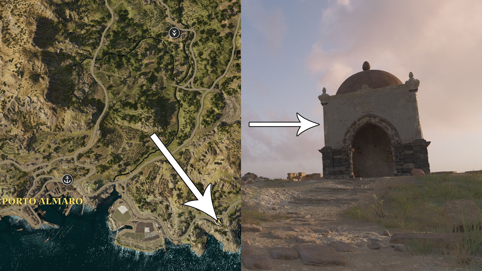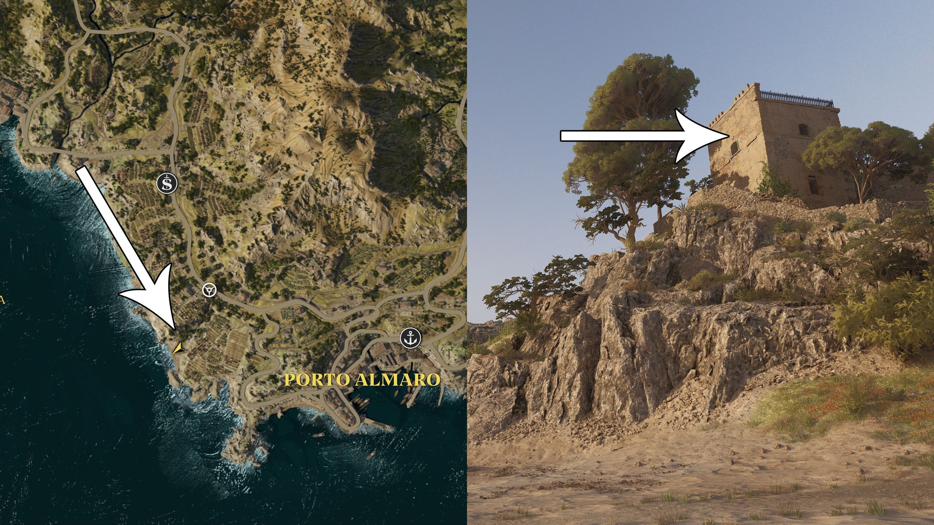 Driving east from Porto Almaro, spot a small building on a cliff and check the seaside side to find it.