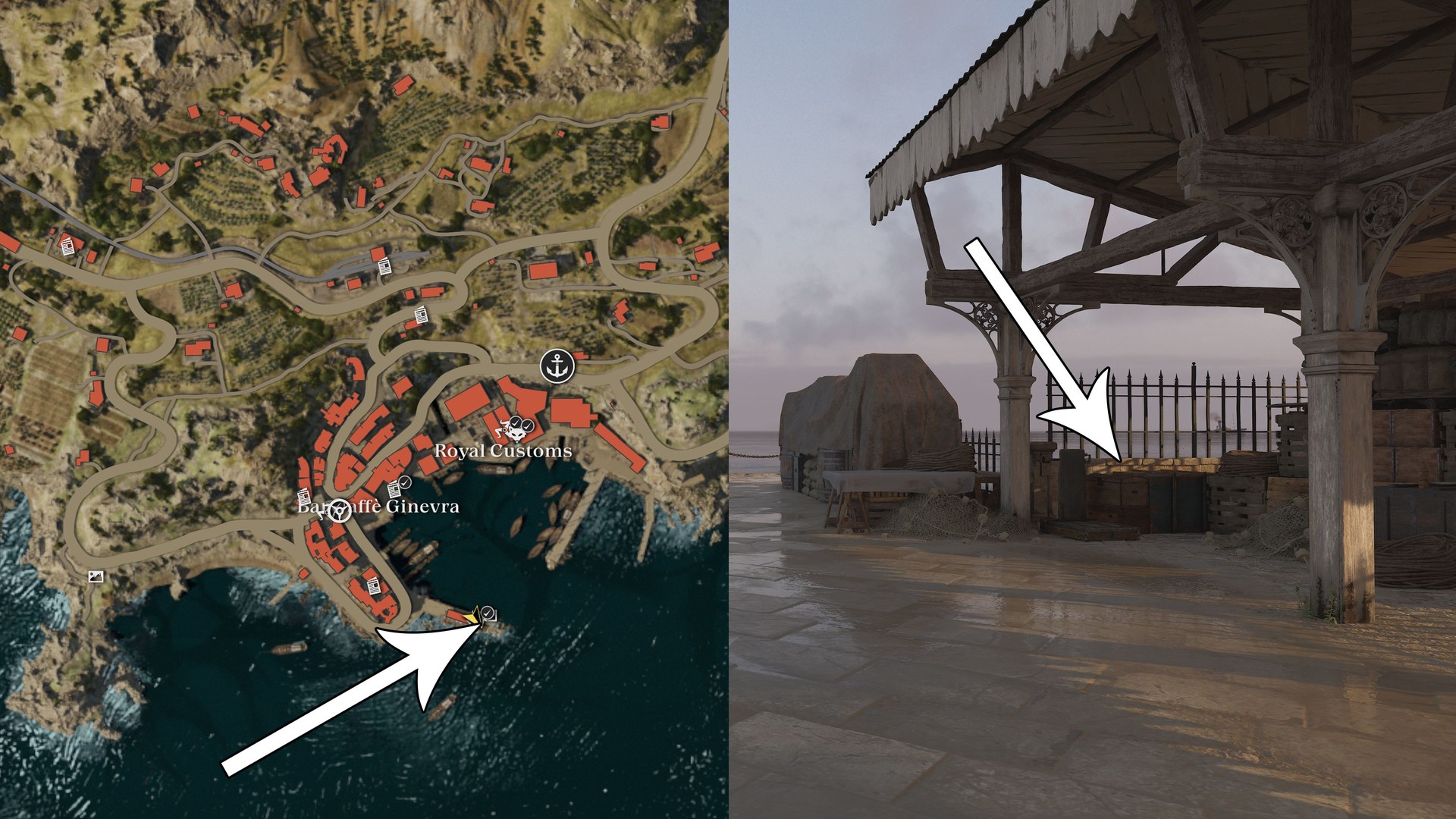 In Porto Almaro, go to the Galante Warehouse. North of the Warehouse, use the stairs to the higher level to find a bench with a Trinacria.
