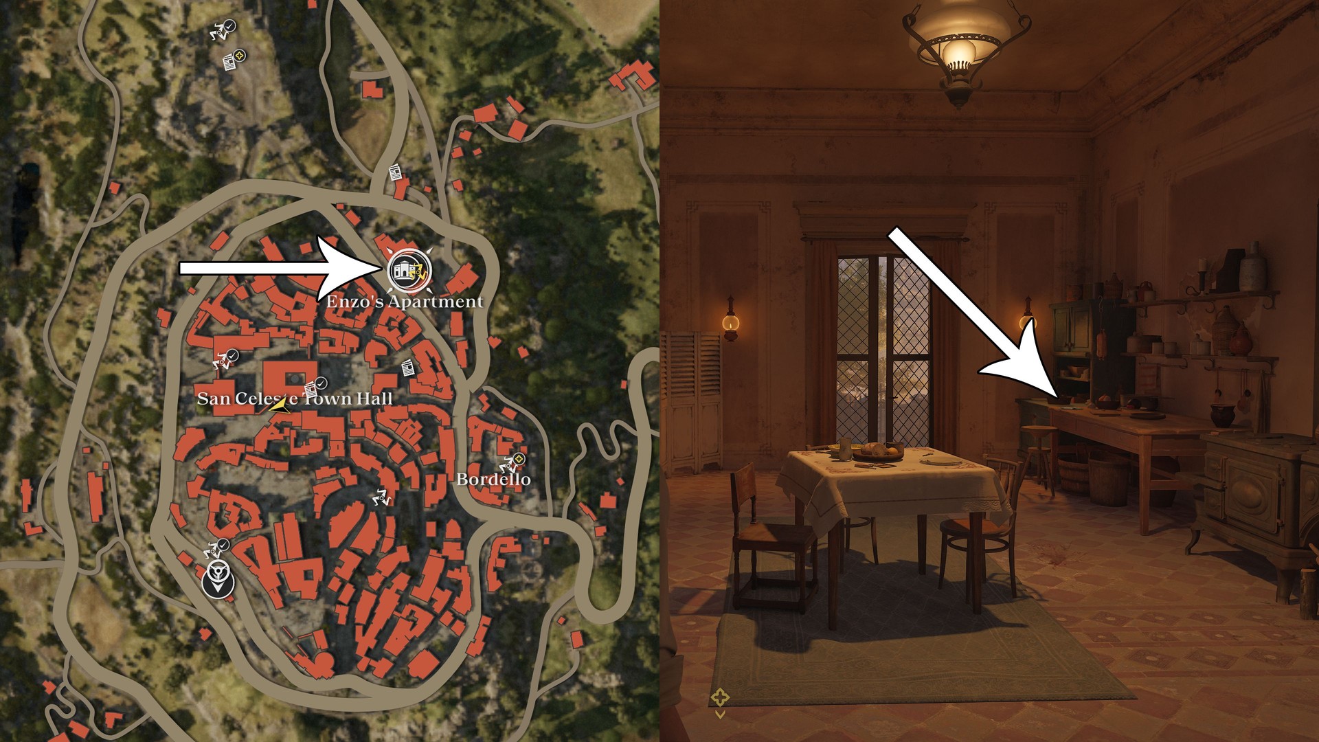 Inside Enzo’s apartment, near the dining table.