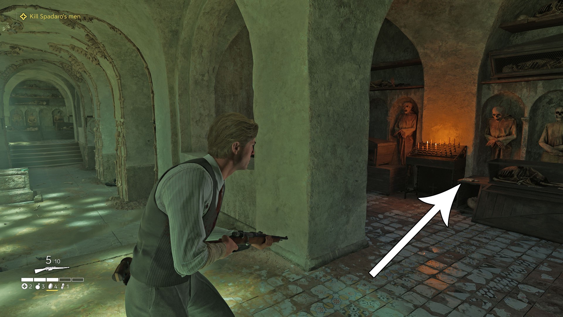 Near the end of the mission, after untying Gennaro, walk toward the stone archway and find the Trinacria there.