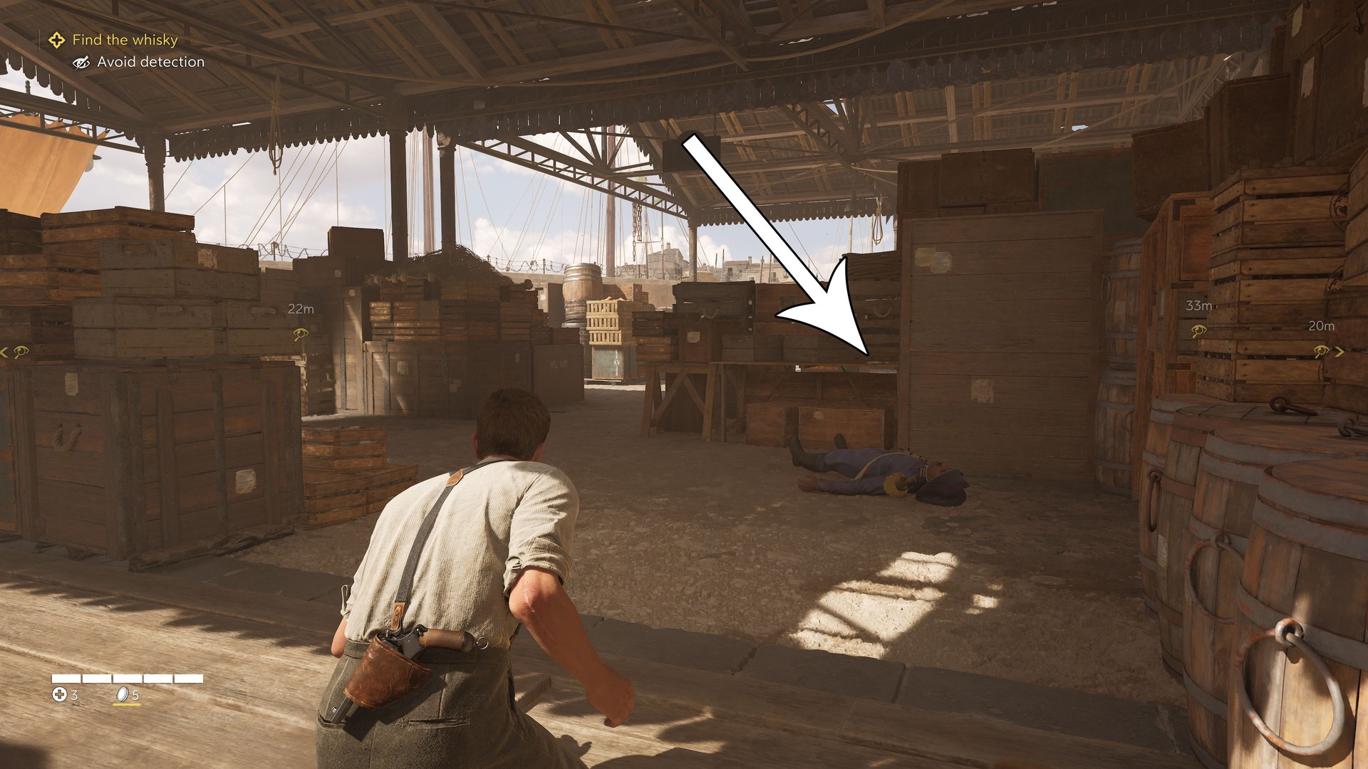 In the large warehouse while finding the foreman’s office. Instead of heading straight to the objective, take the eastern exit and look at the stone wall behind the red Spadaro crate.
