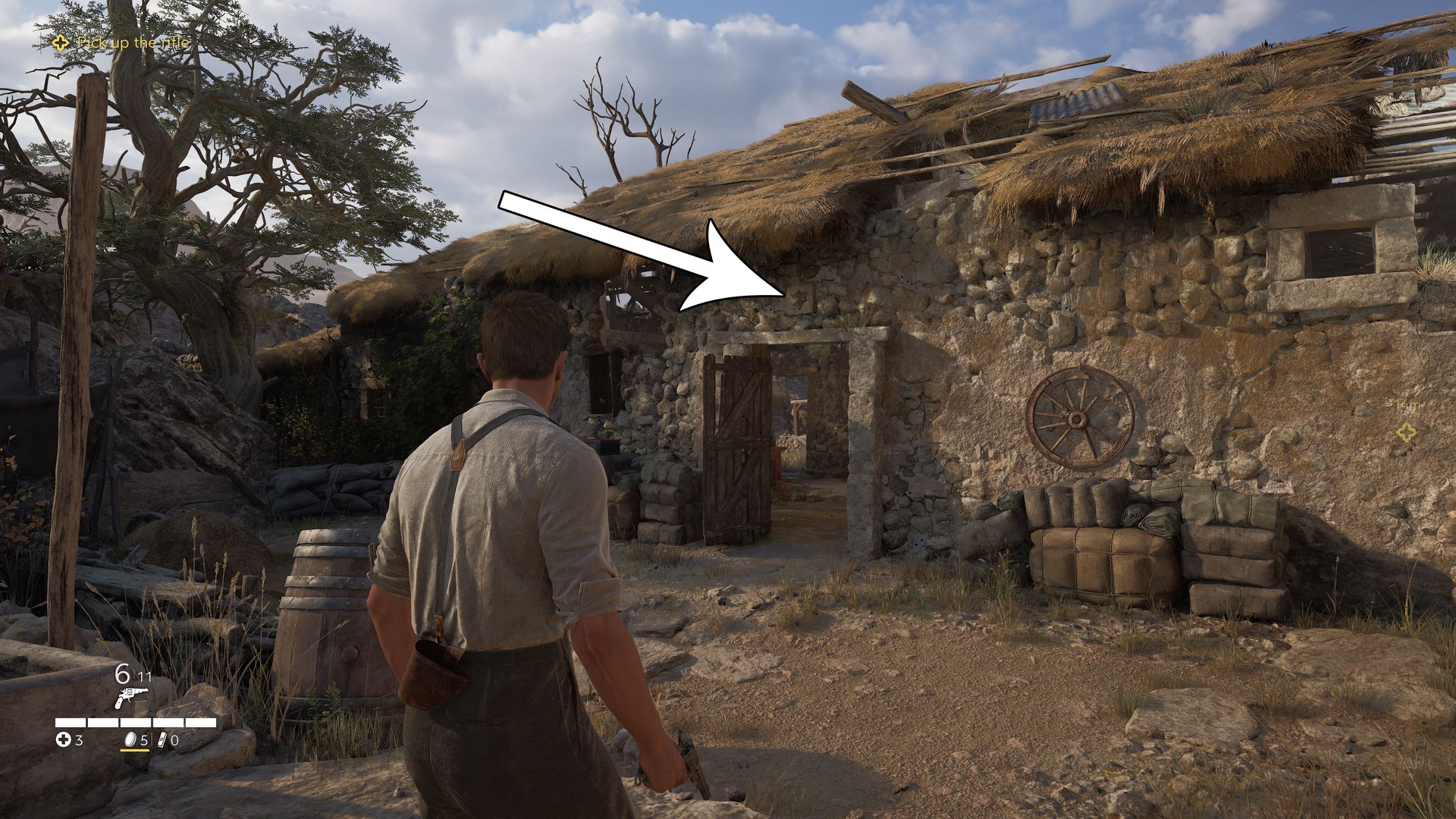 After the bandit fight, enter the hut and leave through the back door. The Trinacria is visible above the door in the small courtyard when looking back toward the hut.