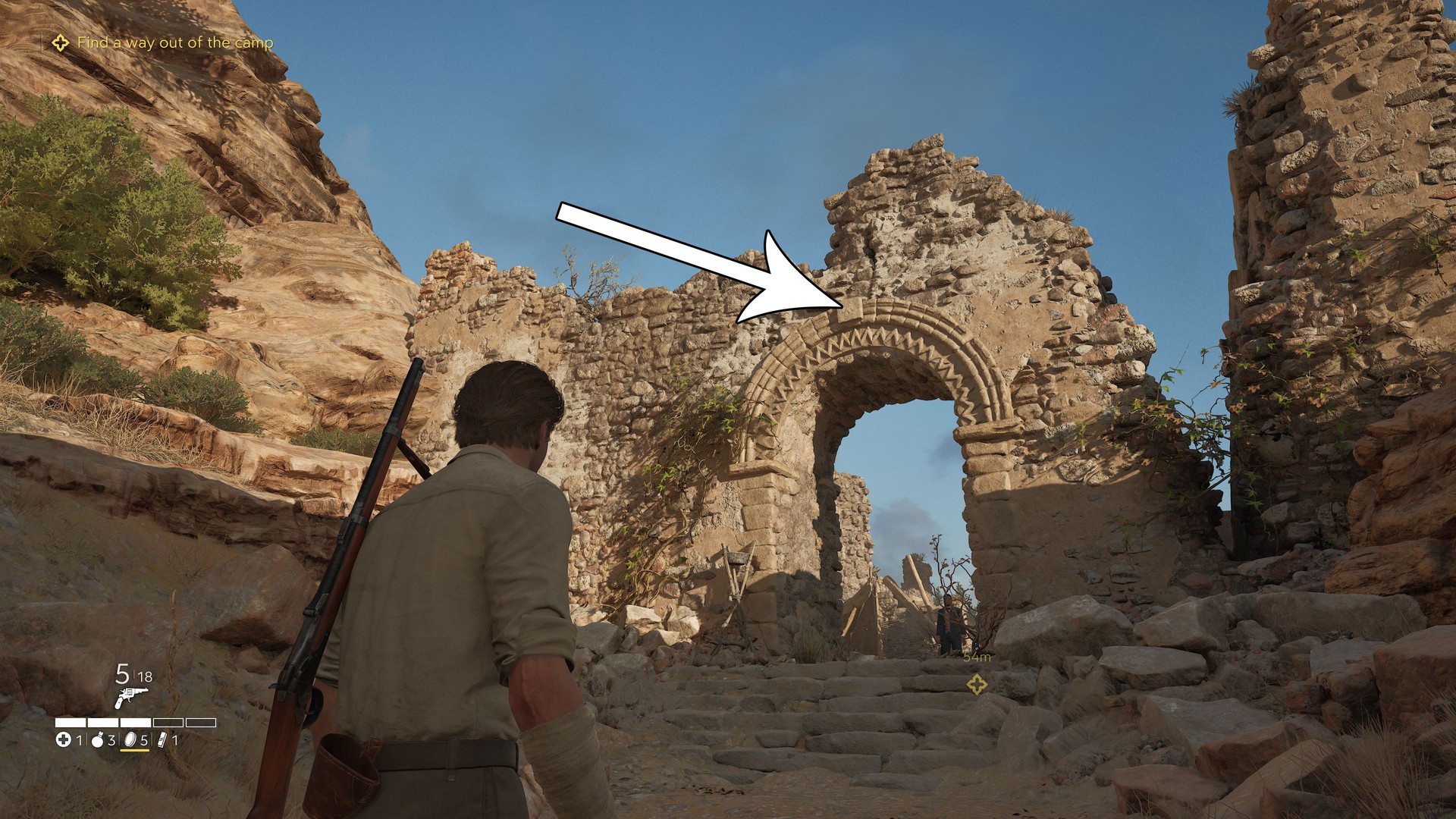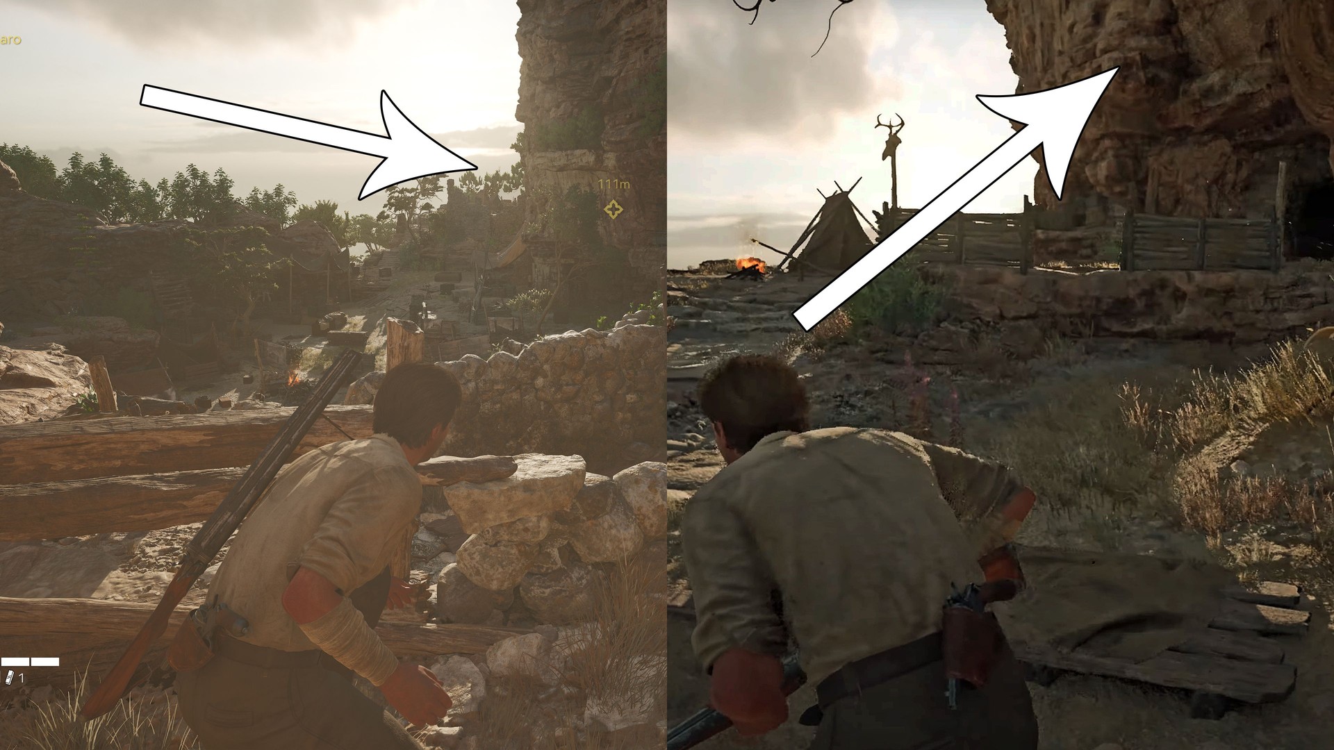 Before entering the large cave area, go to the two tents and campfire at the cliff edge. It’s on the rock wall above the cave entrance (upper-left).