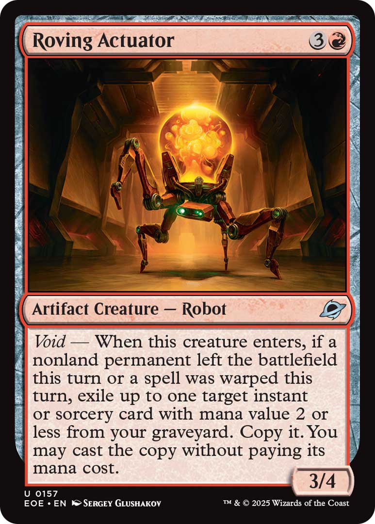 The red artifact creature Roving Actuator introduces the new “Void” mechanic. It triggers when a nonland permanent leaves the battlefield or a spell is warped in, letting you exile an instant or sorcery costing 2 mana or less from your graveyard and cast a free copy. Red decks have plenty of cheap spells to maximize this ability. With Edge of Eternities’ focus on robots, this creature type might become important. It also pairs well with decks using Blink effects, Treasure, or Clues to keep triggering Void consistently.