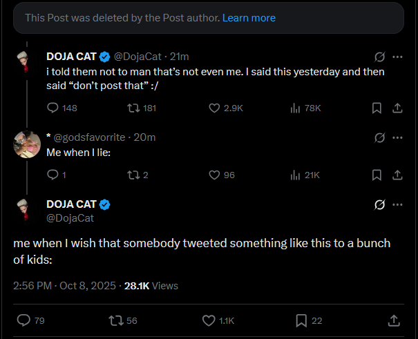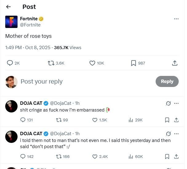 Doja Cat replied in the Fortnite mentions on X, writing: “shit cringe as fuck[.] now I’m embarrassed,” and “I told them not to[.] man that’s not even me,” while appending a wilted rose emoji. She also wrote a separate reply: “me when I wish that somebody tweeted something like this to a bunch of kids.”