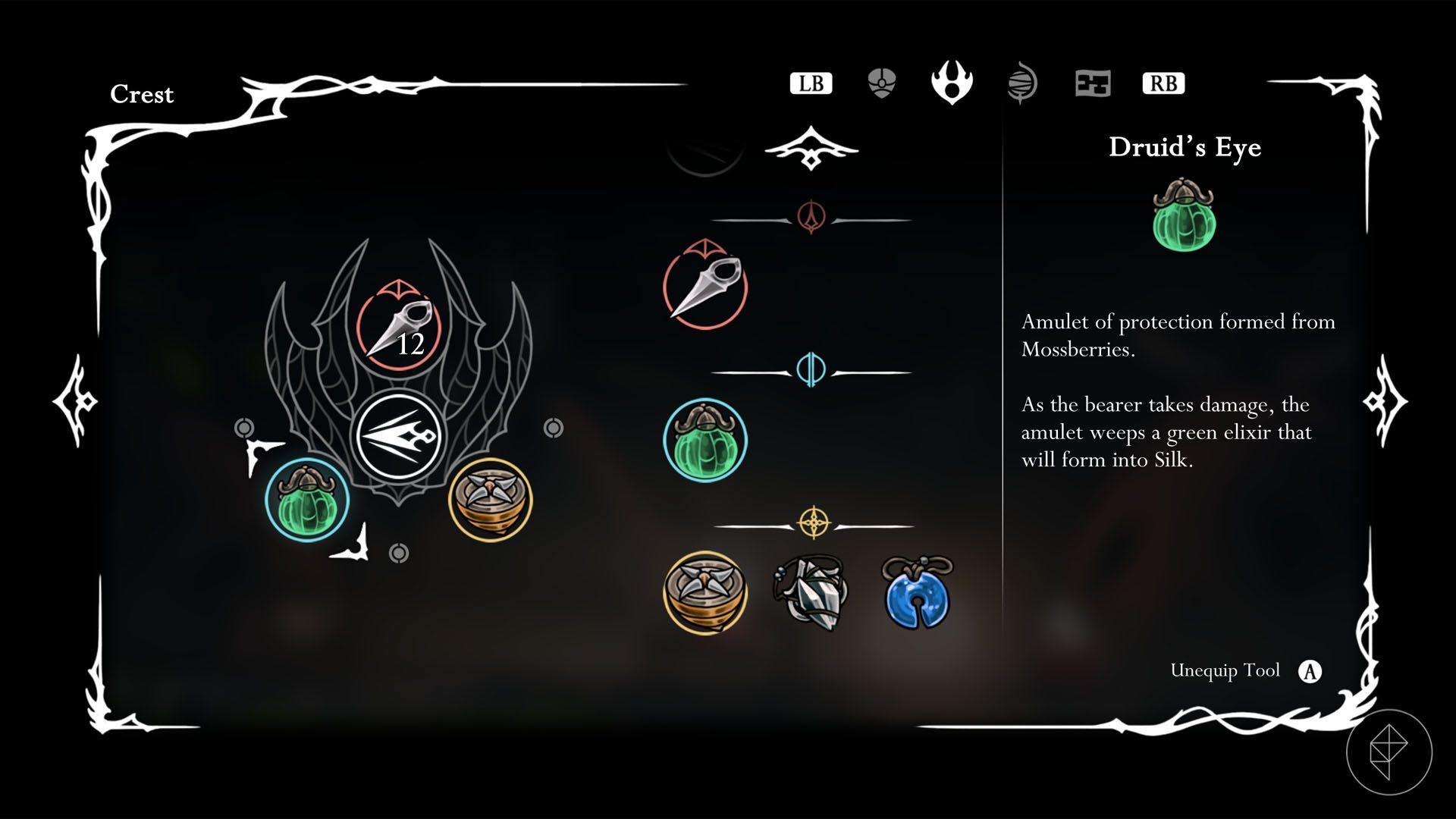 Turn in all three mossberries to Moss Druid to receive the Druid’s Eye crest. Placing this crest into a blue crest slot causes a green elixir to partially refill your silk bar after you take damage. This effect is especially helpful in early-game encounters while you learn Silksong’s movement and combat.