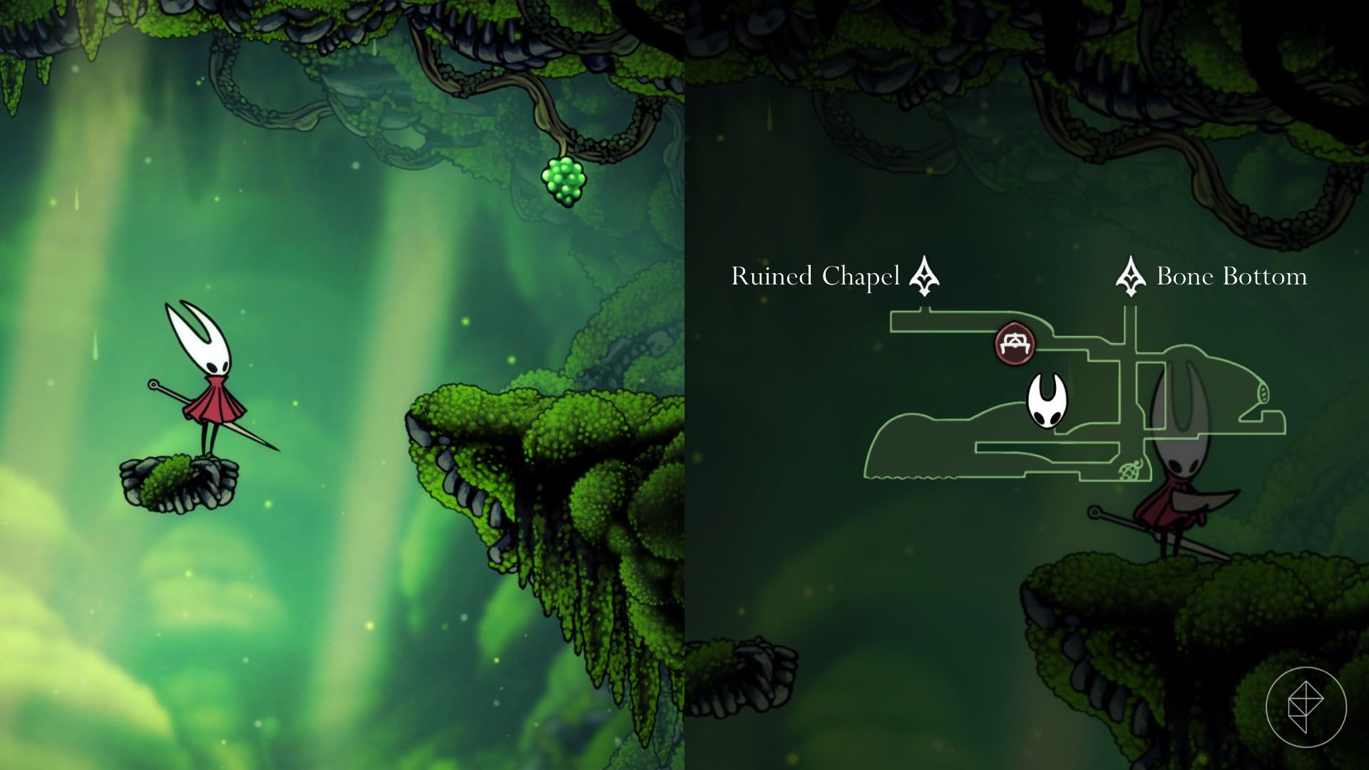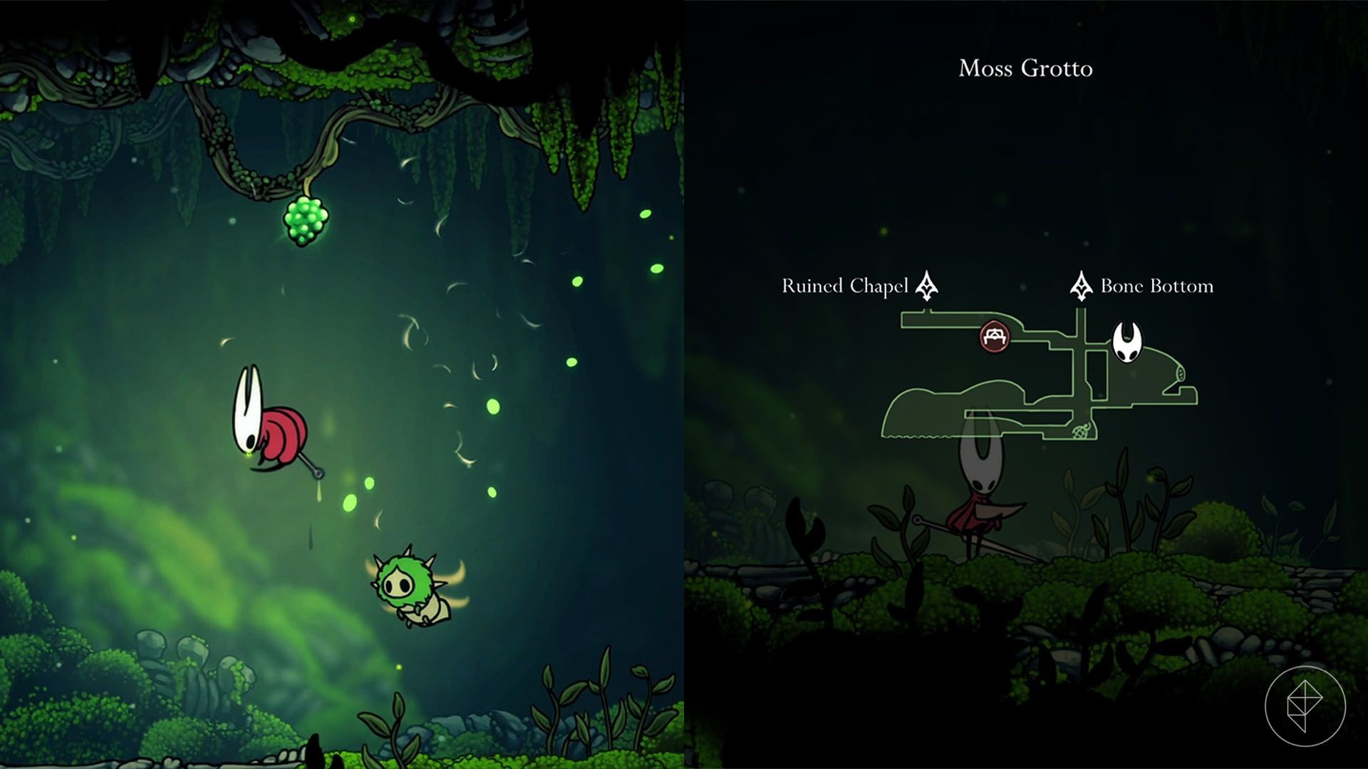 The second berry appears shortly after the first, at the top of the rightmost area in Moss Grotto. However, it’s out of direct reach. Therefore, you must use a pogo technique: wait for a nearby flying enemy to plunge down, hit it with a downward aerial attack, and bounce off its head to gain height. Then quickly slash upward at the mossberry to knock it down and collect it. Note that Hornet’s downward attack is diagonal, so timing and angle matter.