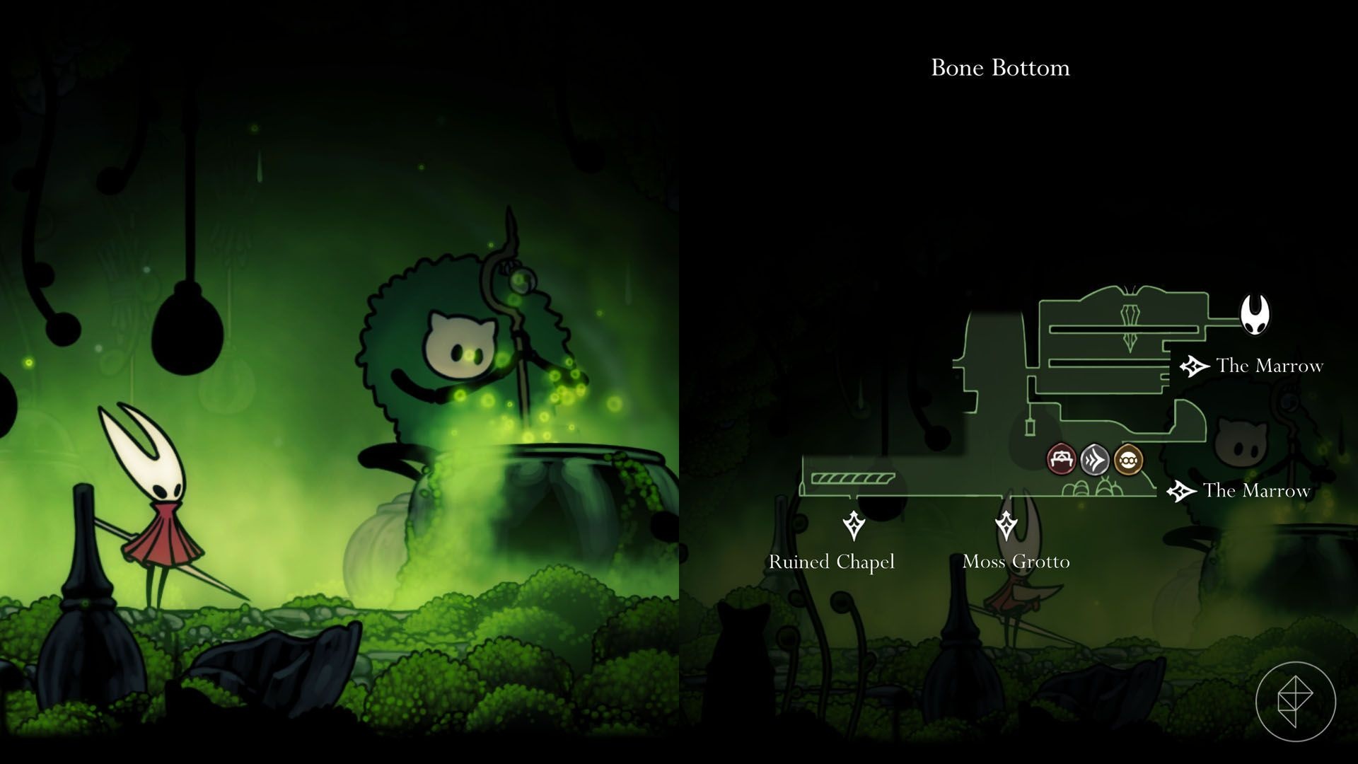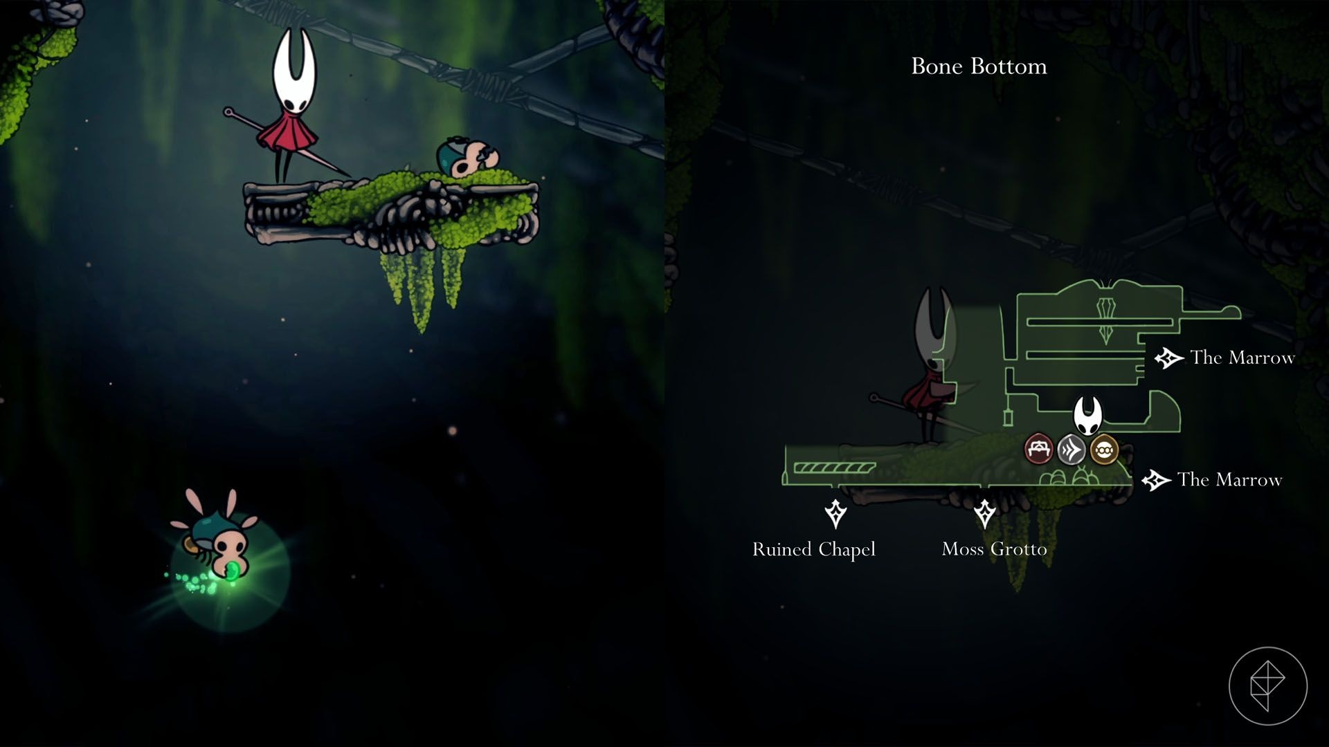 Moss Druid sits inside a small cave near the top-right section of Bone Bottom. To trigger the quest, you must talk to them after you can reach that cave. First, unlock the Silkspear ability. The Silkspear is located at the top of the large room just outside Moss Druid’s cave. After you get it, drop to the bottom of that room, head right, and use the Silkspear to break the silk barrier blocking the path. Then enter the cave and interact with Moss Druid to begin the quest.