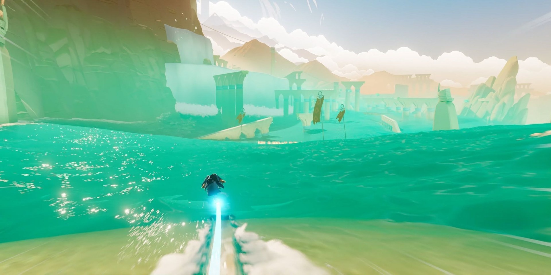 Sword of the Sea focuses on momentum-based movement using a “Hoversword” and a scoring system that tracks tricks and speed. The team includes Journey’s art director Matt Nava and composer Austin Wintory. The game offers New Game Plus content that expands available movement tricks and scoring features.