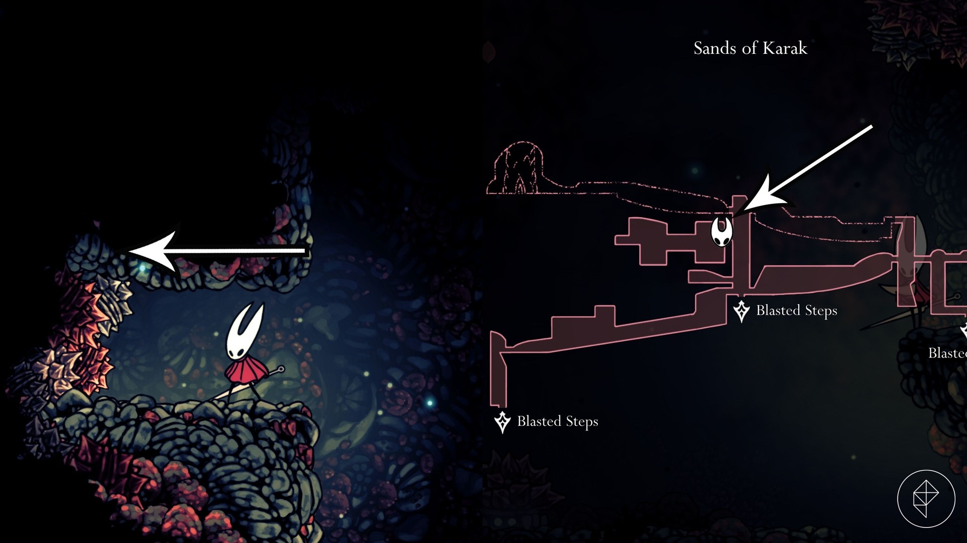 From the Blasted Sands or Shellwood Bellway stations, use Cling Grip to ascend through hanging platforms and bells, and buy the Blasted Sands or Sands of Karak maps from Shakra if needed. In the vertical Sands of Karak rooms, hit yellow orbs to spawn parkour lines, then break red spike clusters with downward Needle strikes until you reach the Crustnut.