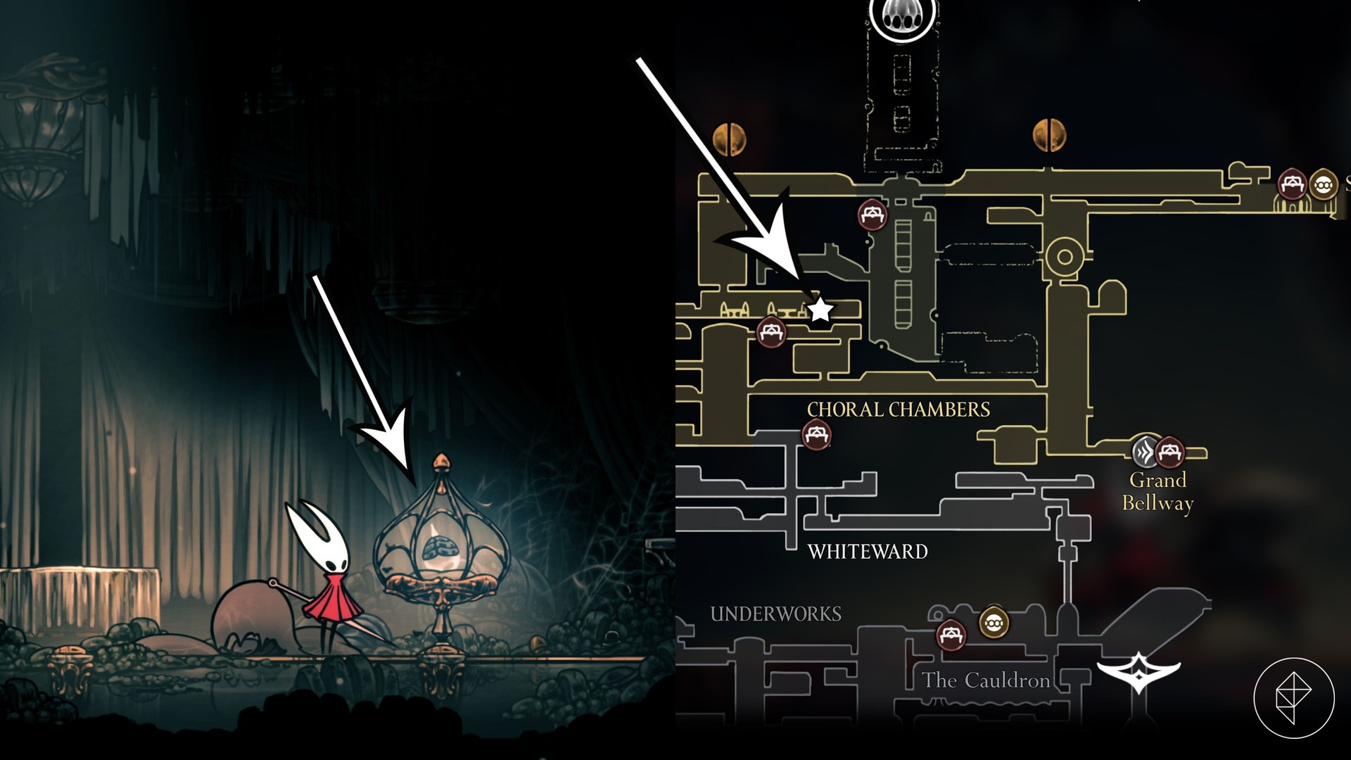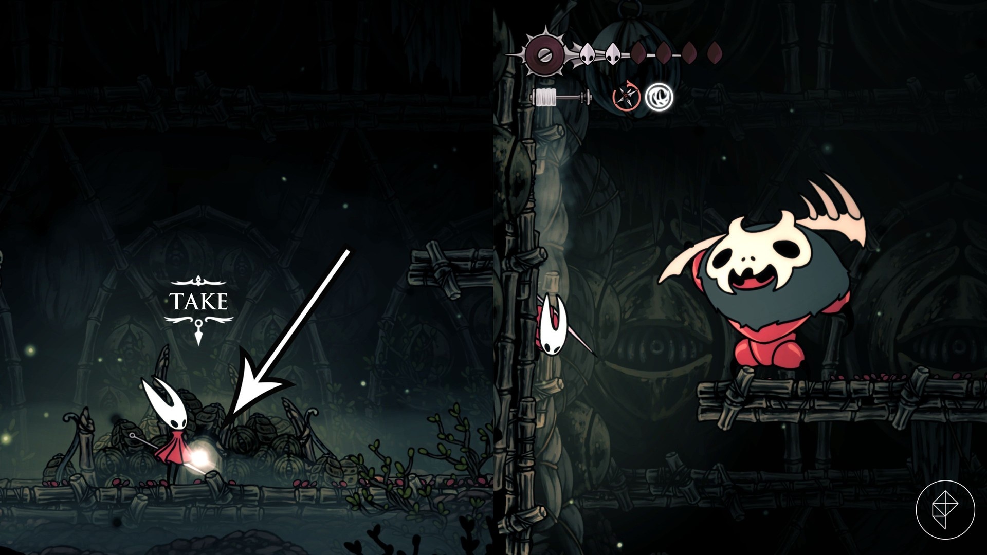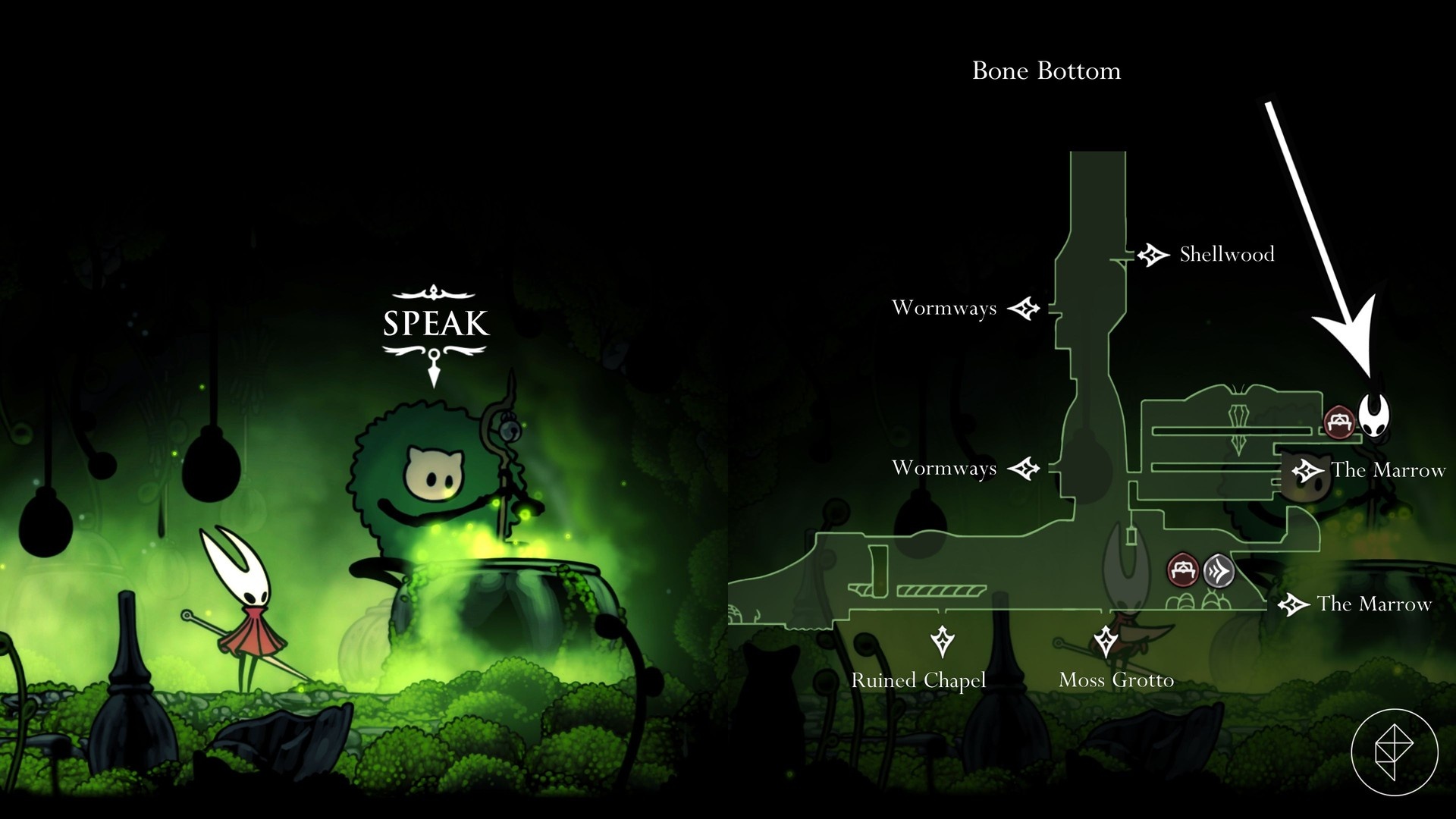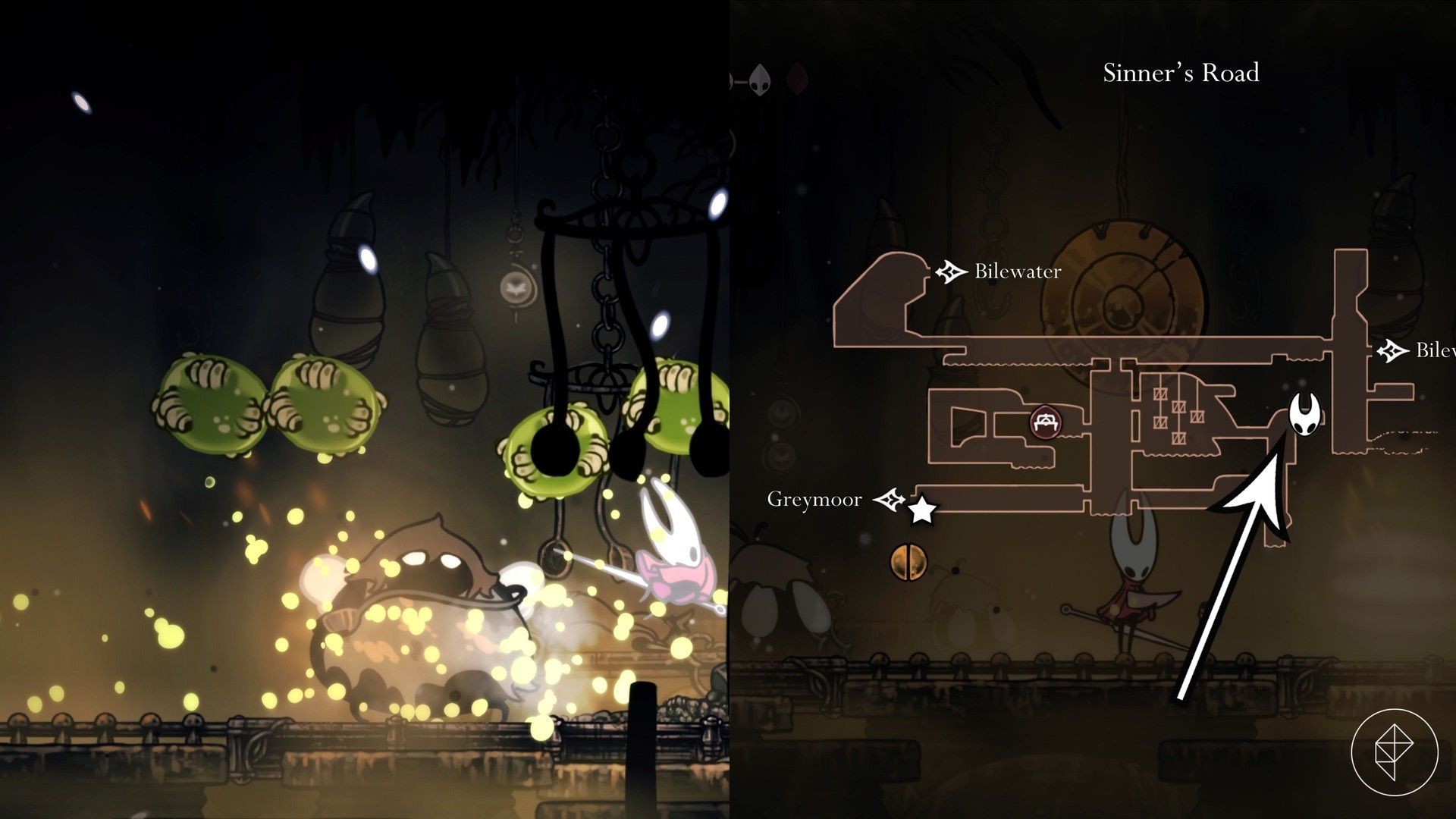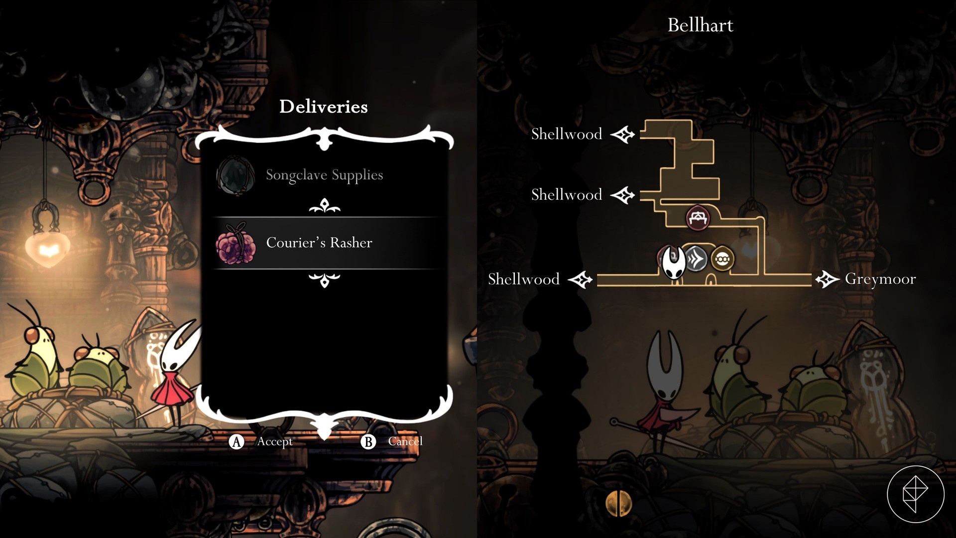 From Greymoor’s Bellway, head northeast toward the Halfway Home area, then follow the signs to the broken bench and fix it by hitting the strings beneath. Unlock the boss door to shorten the run, hit the golden gong to start the fight, and defeat Lugoli to obtain the Pickled Muckmaggot.