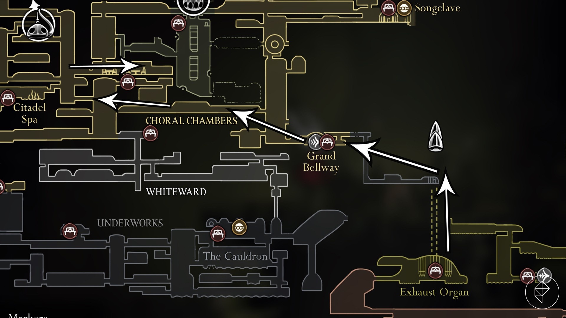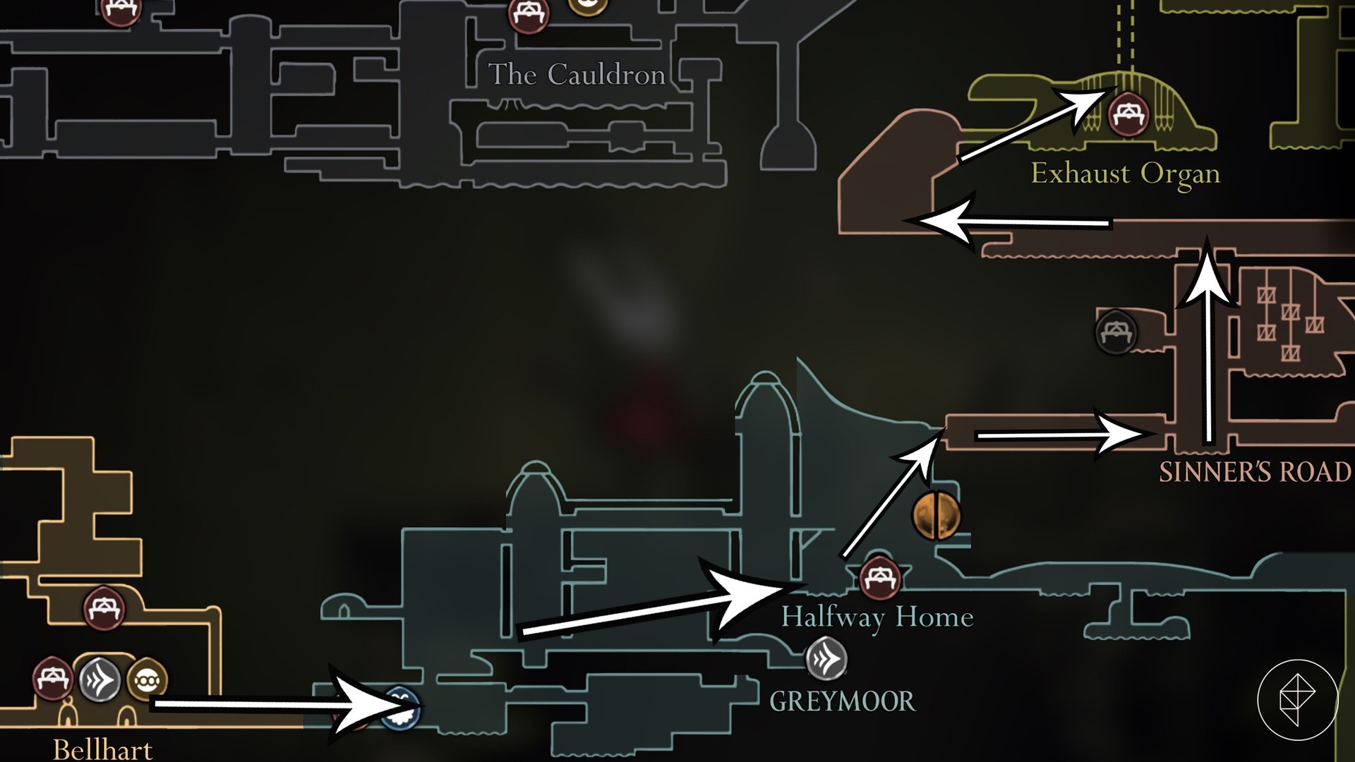 A recommended path: start in Bellhart, run east through Greymoor, pass Halfway Home (take the lift up to Sinner’s Road), cross the vertical areas to reach the Exhaust Organ, then proceed through the Phantom arena, Grand Bellway, and the Choral Chambers. Finally, climb up into Loyal Mergwin’s dining hall and hand the Rasher over before the durability runs out.