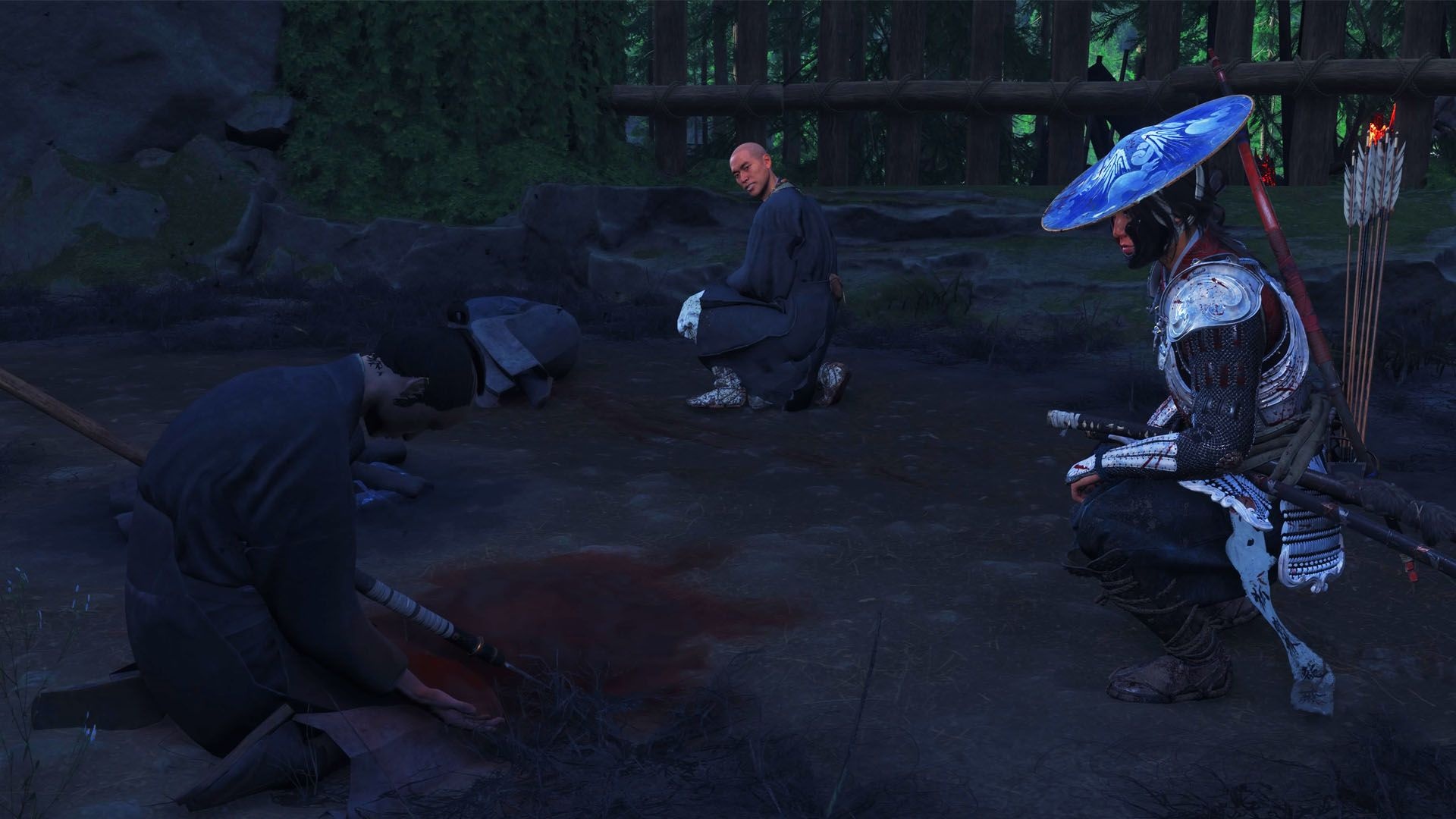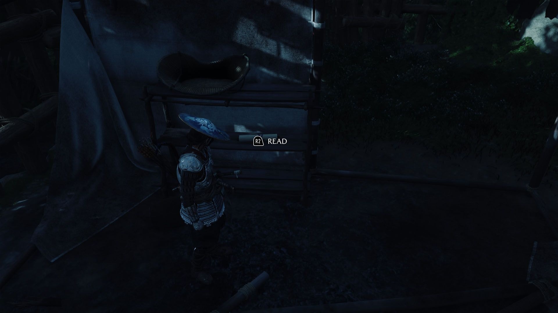 After the ronin are down, untie the healer who was being held captive. Then, move into the camp and investigate the scene. Use your hook to open the entrance if needed. Inside, examine three things: a body with a spear through it, a bucket containing bandages, and a nearby chest. Those investigations will reveal a scroll that mentions “The Curse of Kanemori.”