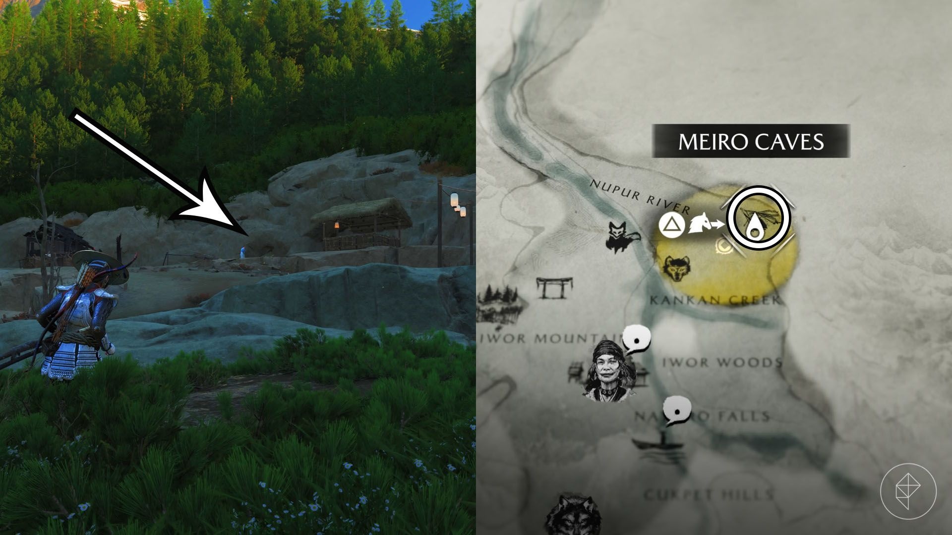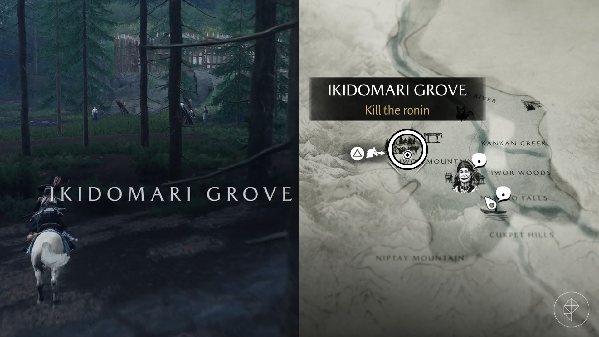 First, travel to the Nayoro Wilds, which is north of the Tokachi Range. You can reach this area while following the Kitsune quest. Head to the Ikidomari Grove camp, located north of Iwori Mountain. As you approach, the “The Face of a Master” quest will be added to your log. Nearby you’ll find a few ronin standing in front of a wooden gate; defeat them to continue.
