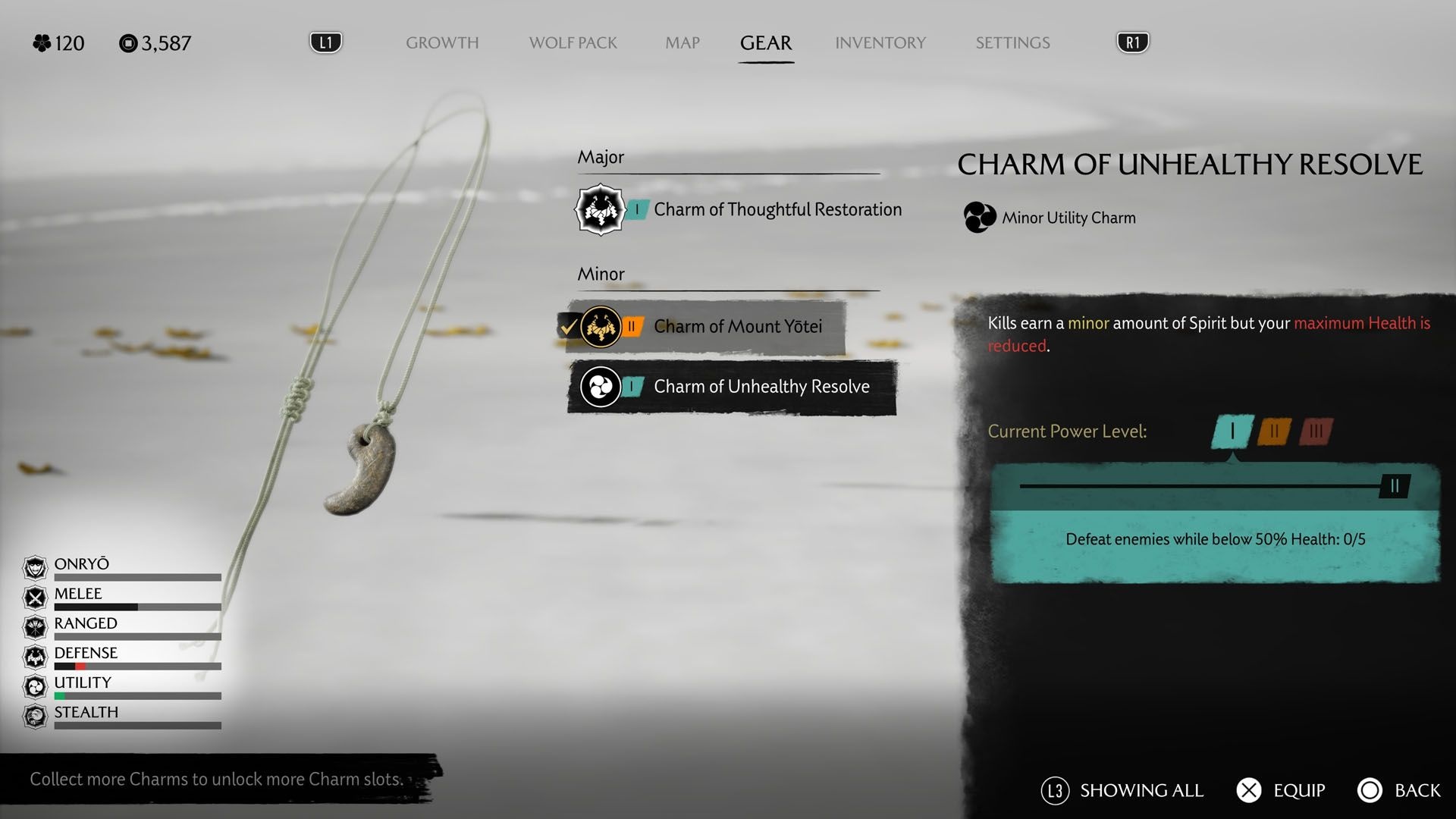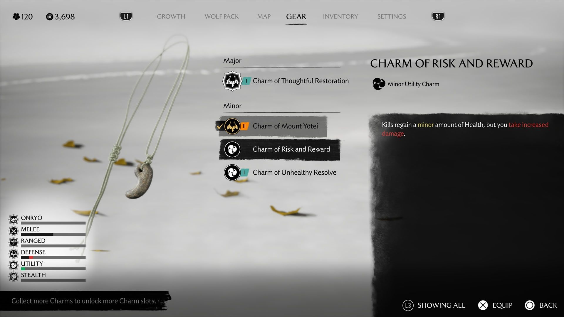 After you find Kanemori’s body in the Meiro Caves, you receive the Charm of Risk and Reward. This charm is also a minor utility charm: it gives a small health recovery on enemy kills, but it increases the damage you take. In other words, you heal a bit per kill while becoming more vulnerable to incoming damage.