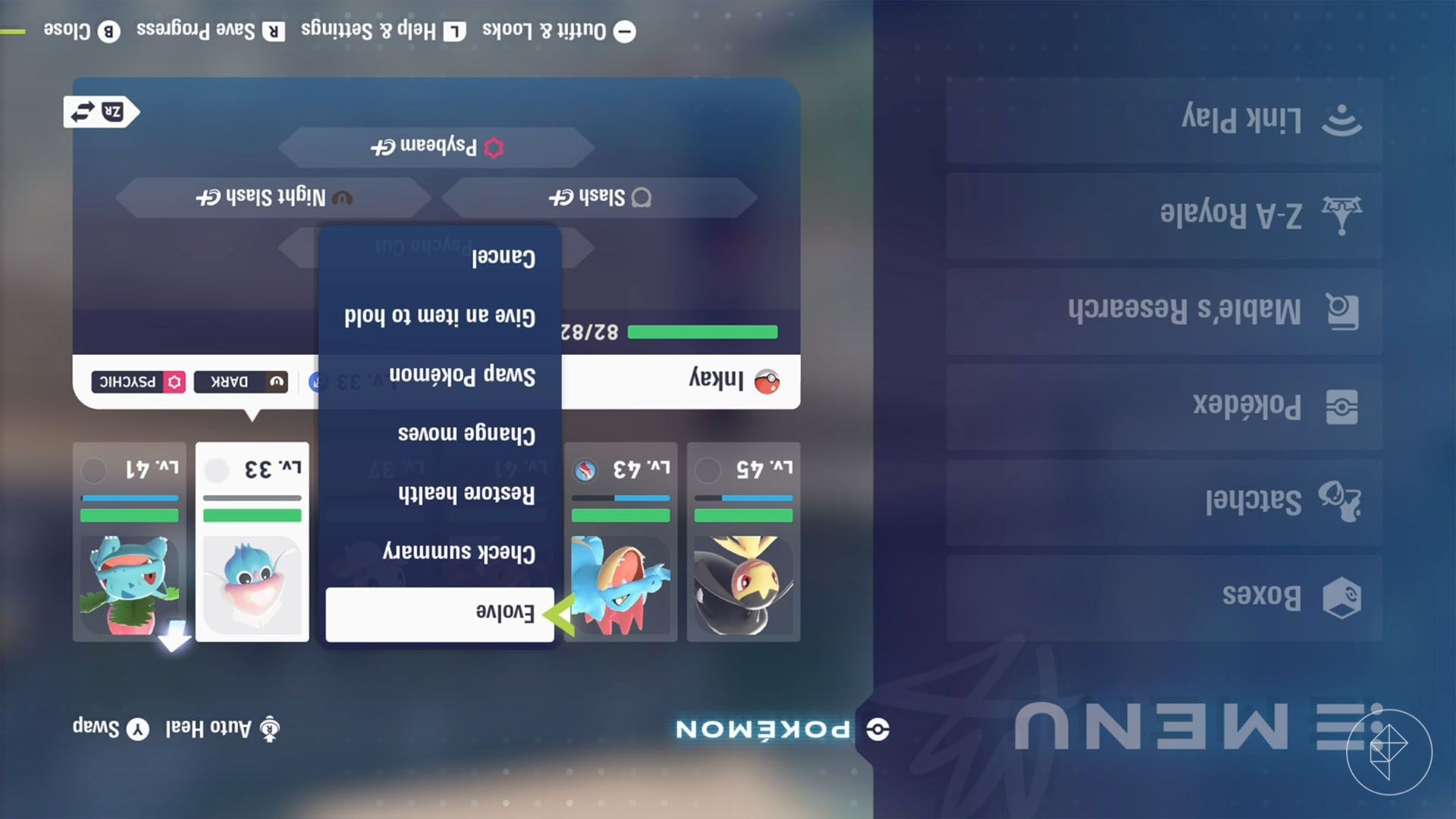 Note that you will not see the usual evolution arrow above Inkay’s sprite. Instead, the “Evolve” command appears when the console is upside-down and the other conditions are met.