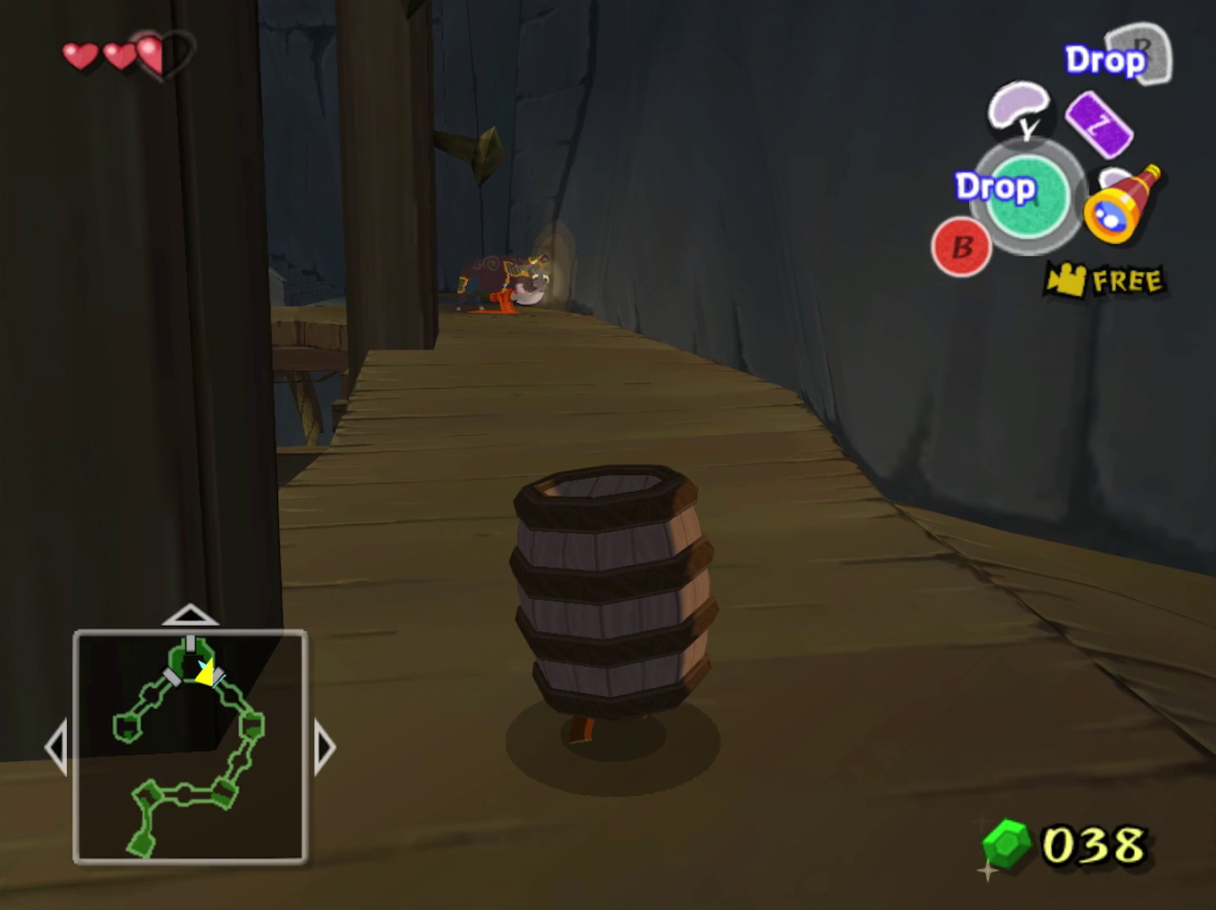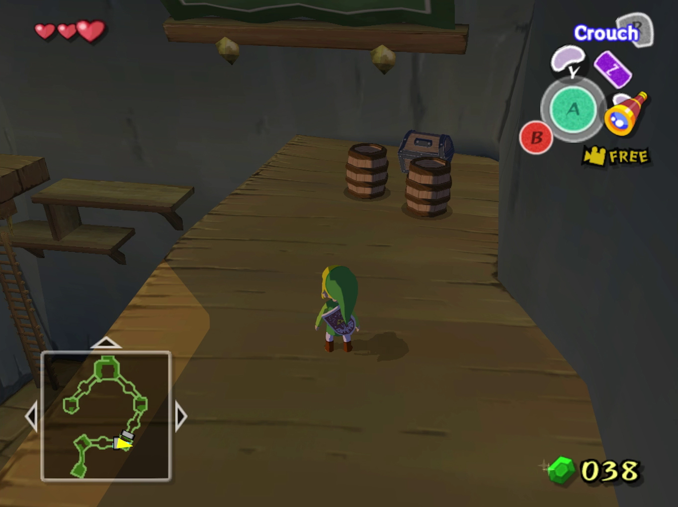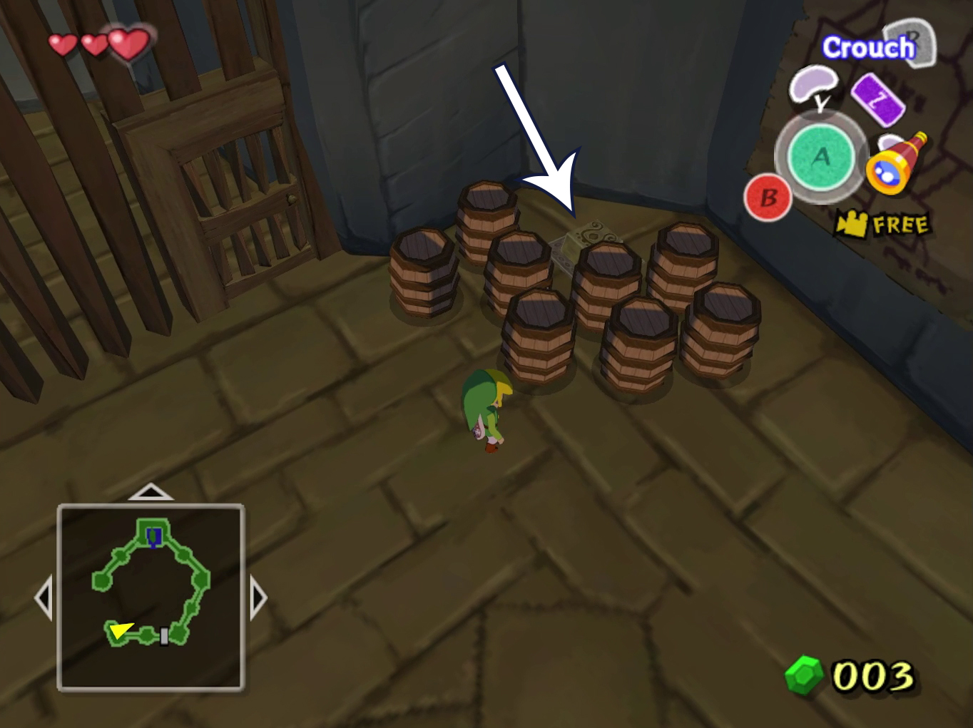 Feeling adventurous? Jump down near the jail cell and look for a hidden switch behind barrels. Trigger it for your first Piece of Heart. Once done, just get caught again to reset your position.