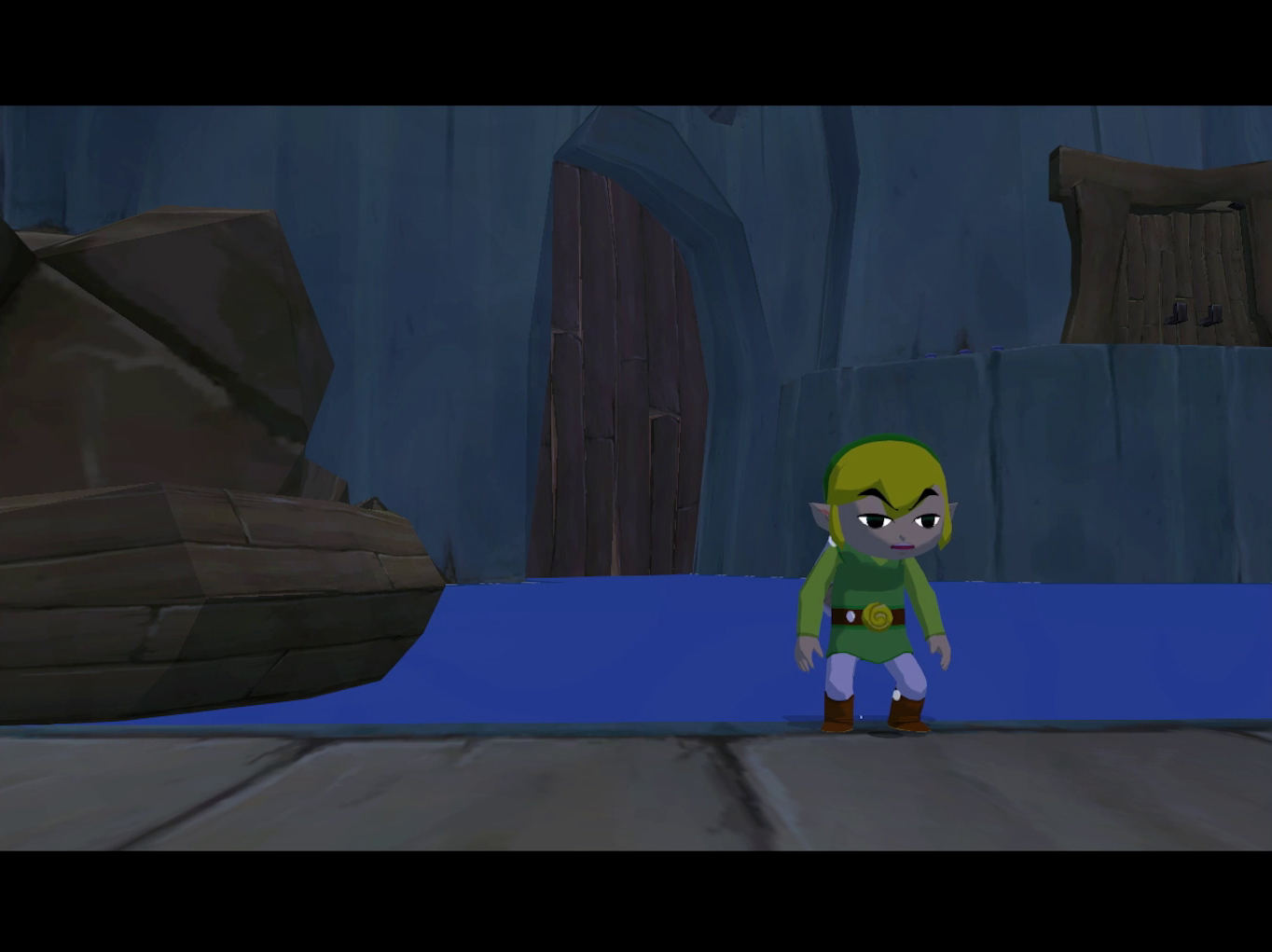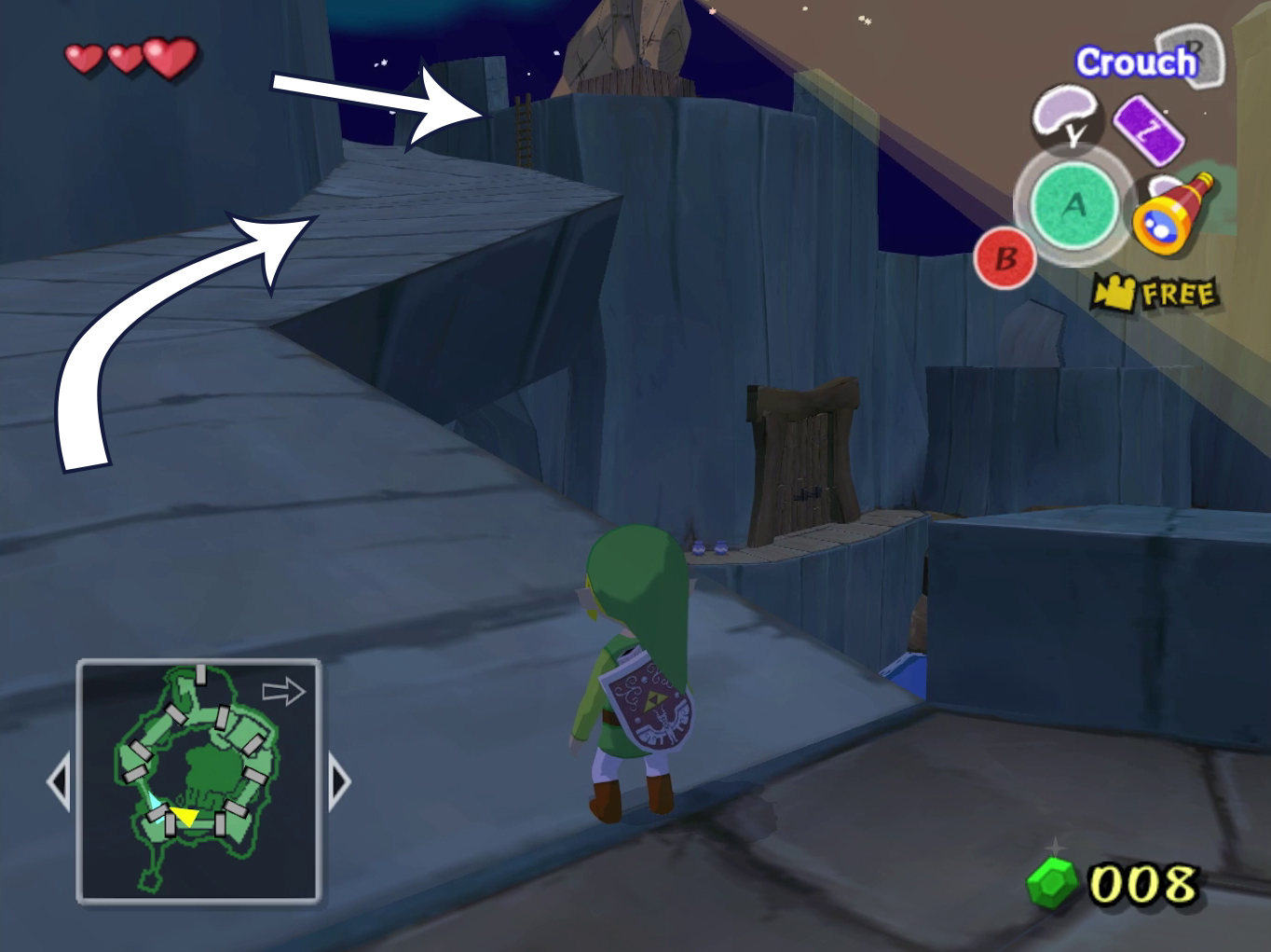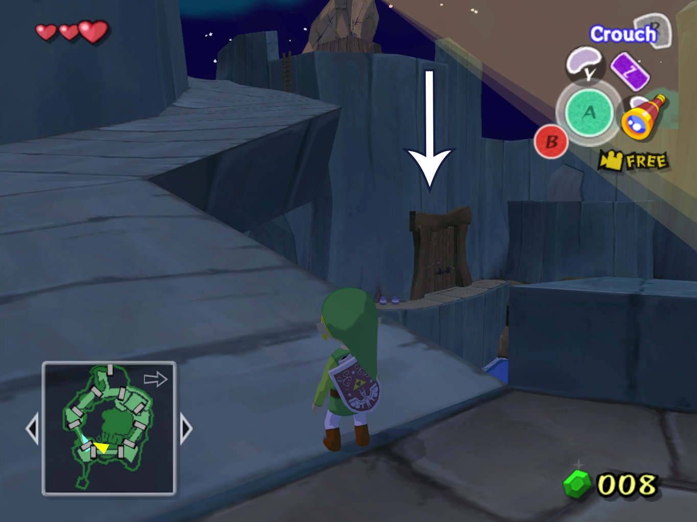 Step off the boat and head up the main path. You’ll spot a flat area with red rupees and those pesky spotlights. If you’re collecting rupees, use barrels for cover, but you can come back later. Either way, grab a barrel and sneak up the stairs, ignoring the big doors for now.