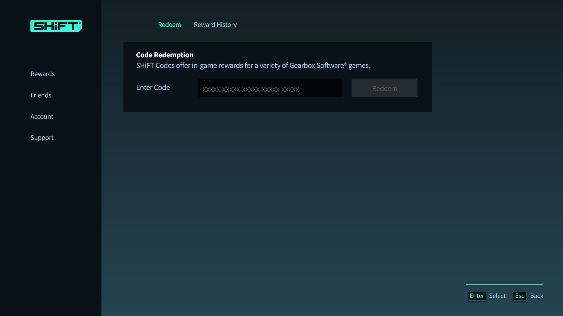 Open the main menu (press Esc on PC or the menu/start button on a controller). Then choose Shift from the list. Next, go to the Rewards tab and enter the code. If it’s valid, the reward will appear in your inventory.
