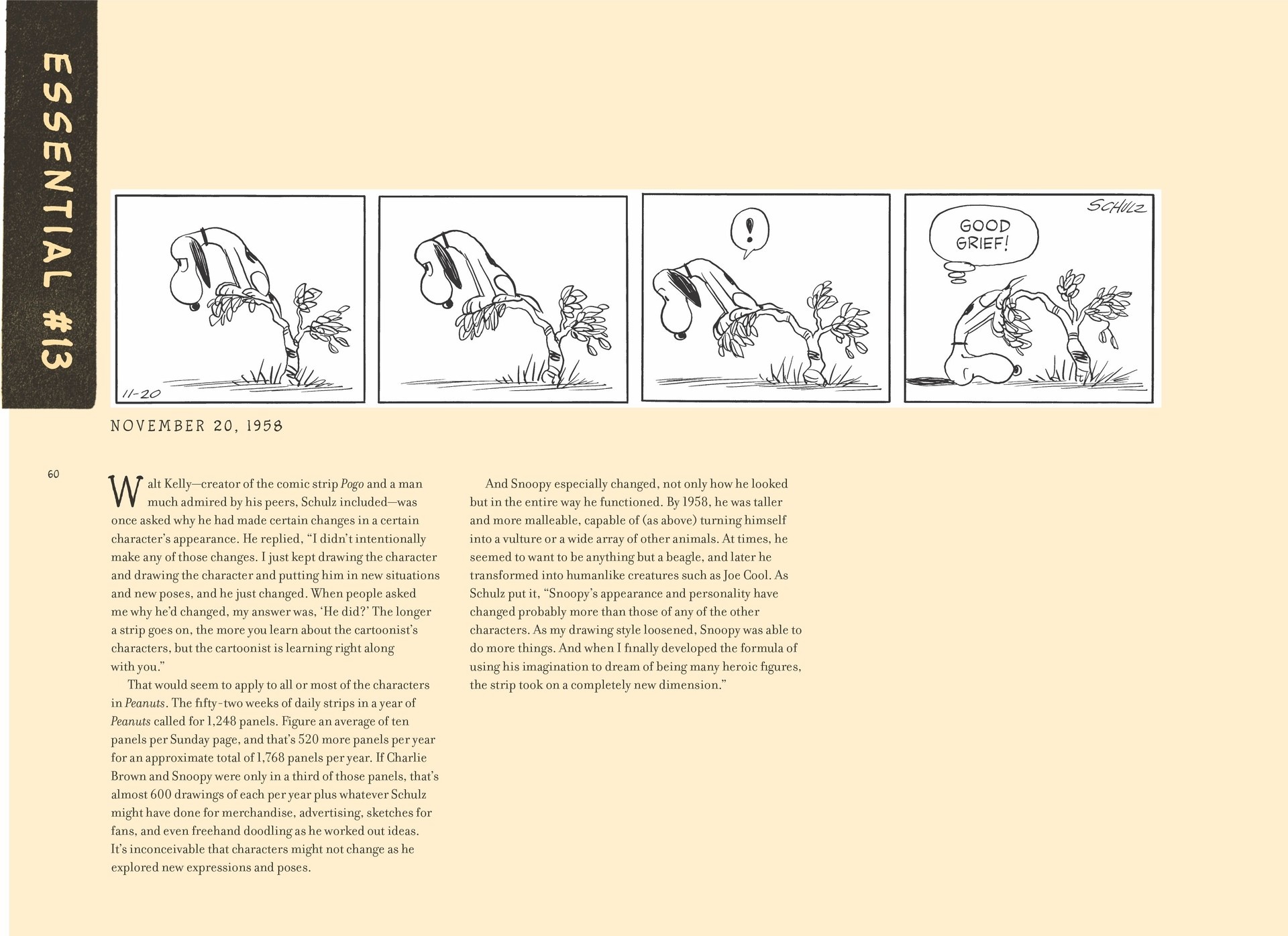 In other words, repetition and experimentation shaped the dog you know. As Schulz refined his approach, the strip’s visual language expanded, and Snoopy’s motions and poses became more expressive over time.