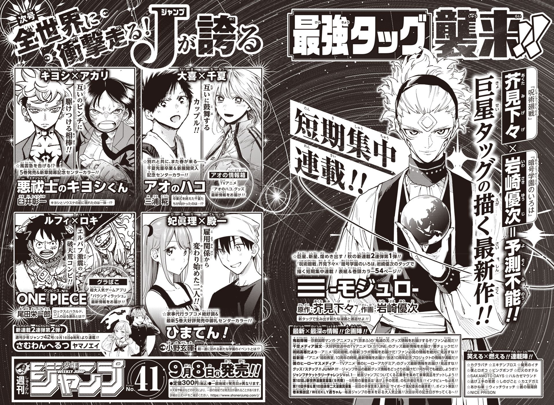 Shueisha listed a new short-term serialization called Mojuro in Weekly Shonen Jump’s 41st issue, with a debut date of Sept. 8. Gege Akutami is credited as the writer, while Yuji Iwasaki (known for Cypher Academy) will handle the artwork. The magazine named this a short-term run rather than an ongoing series.