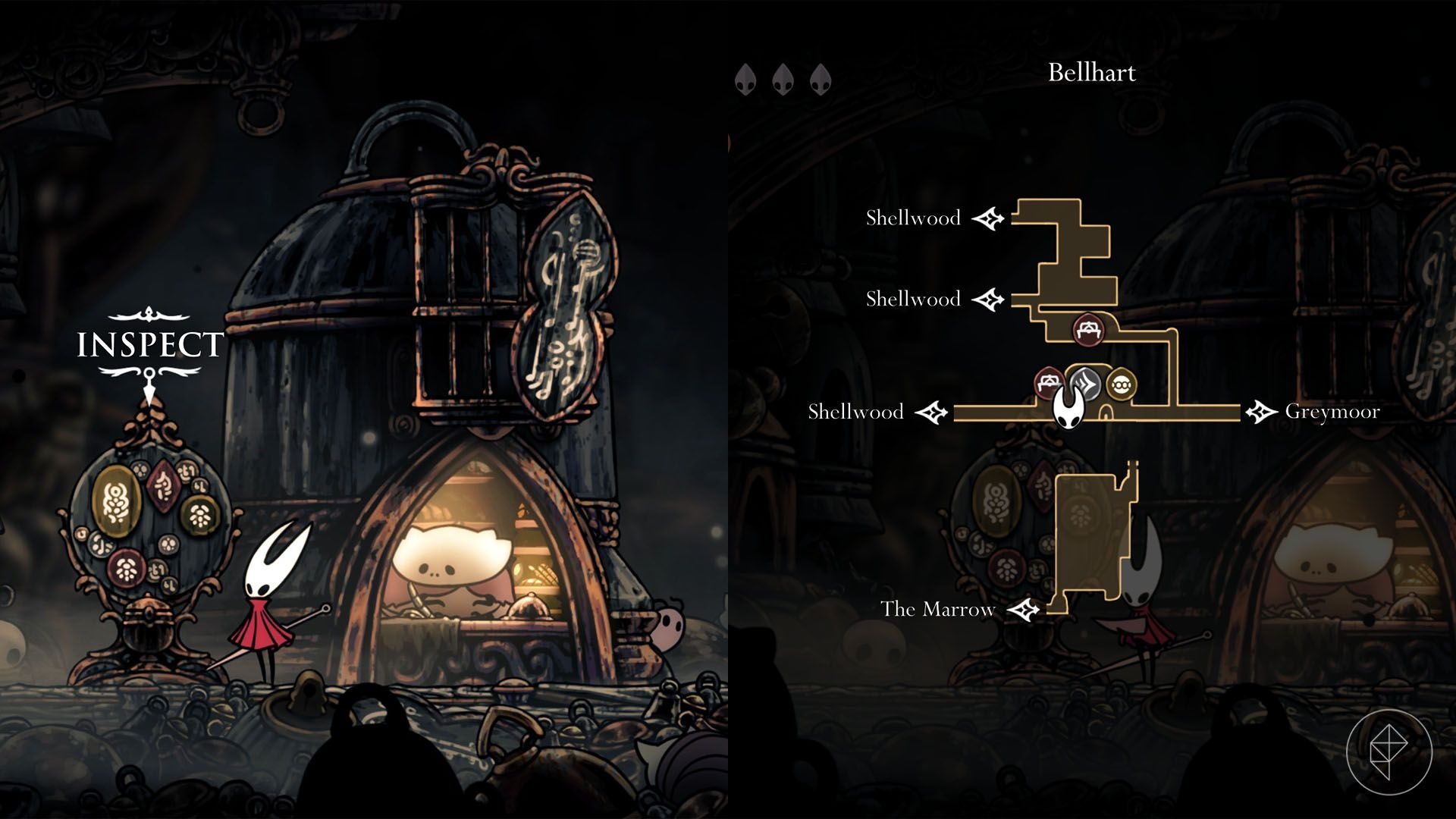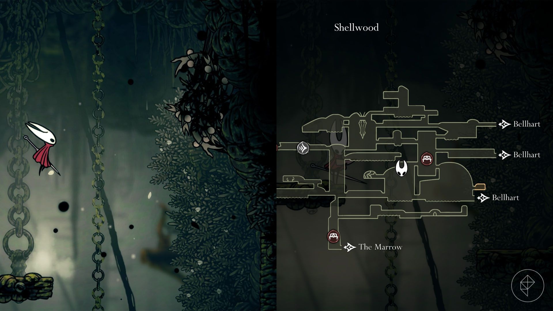 From the Shellwood Bellway station, go right into the next room. Glide to the right path, take the exit at the top, then pogo over enemies and plants to reach a shard at the end of the path.