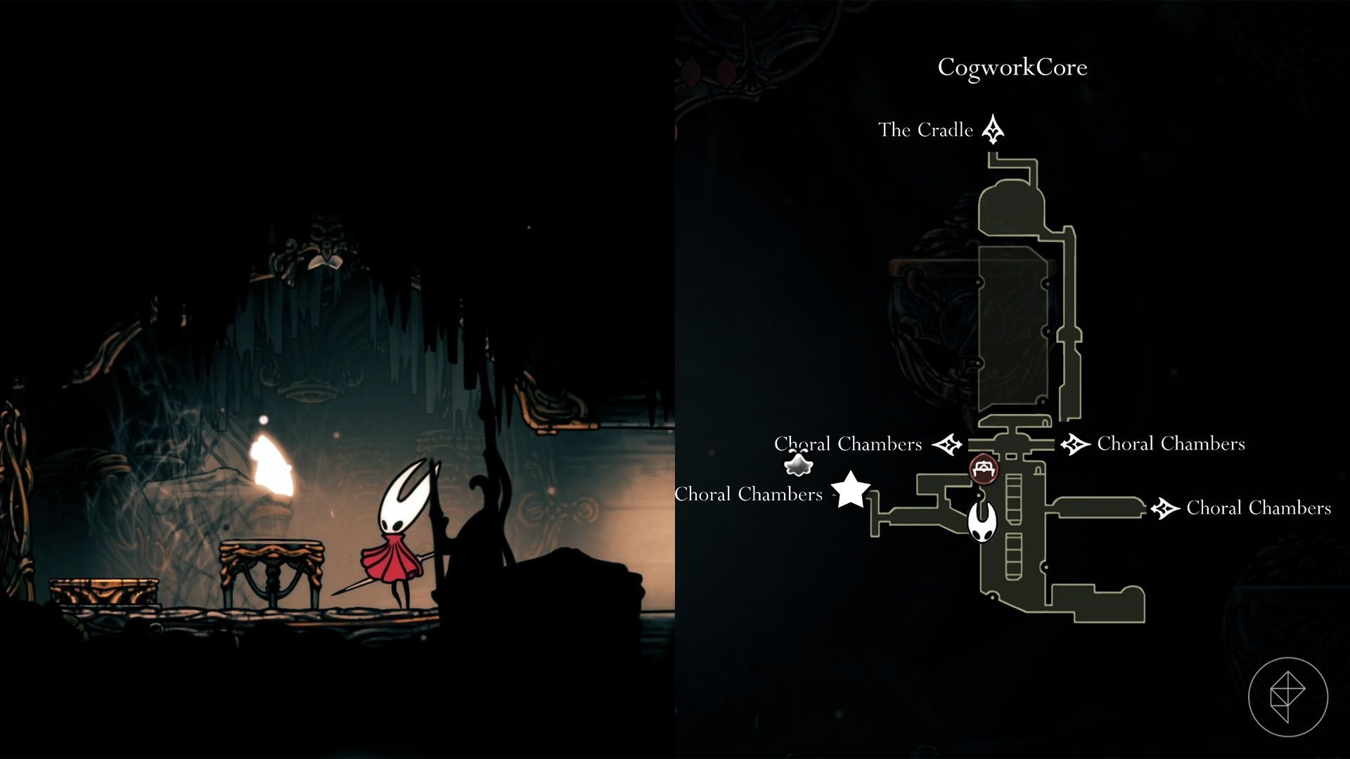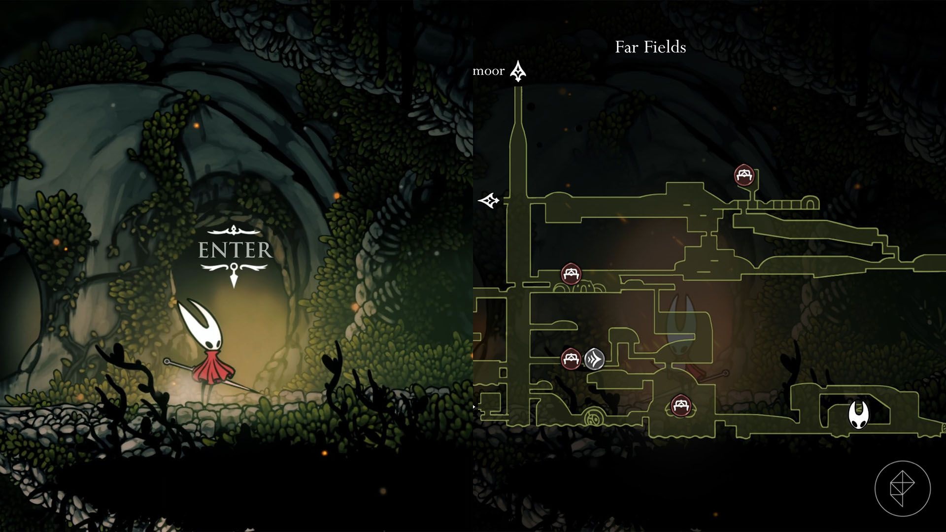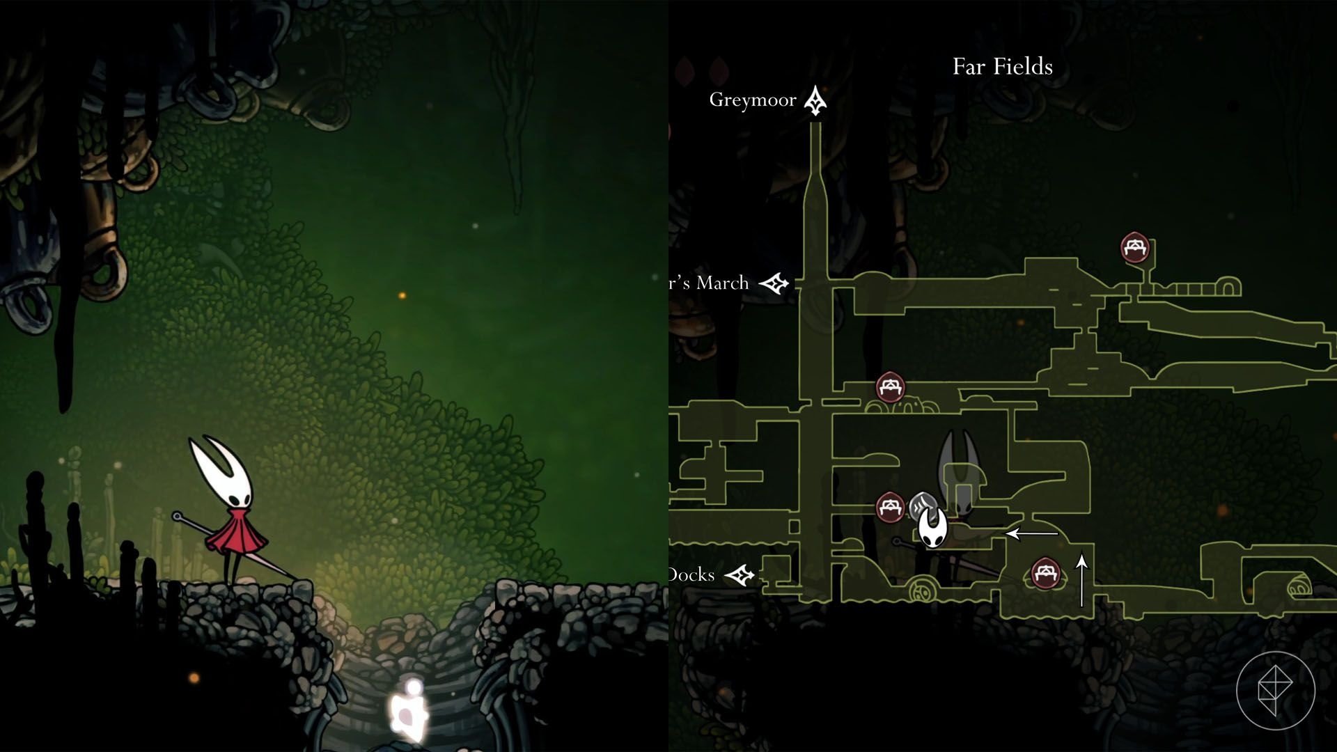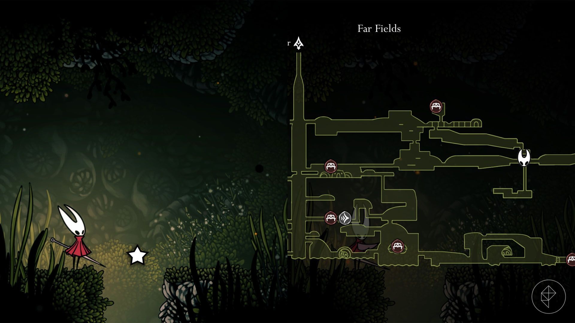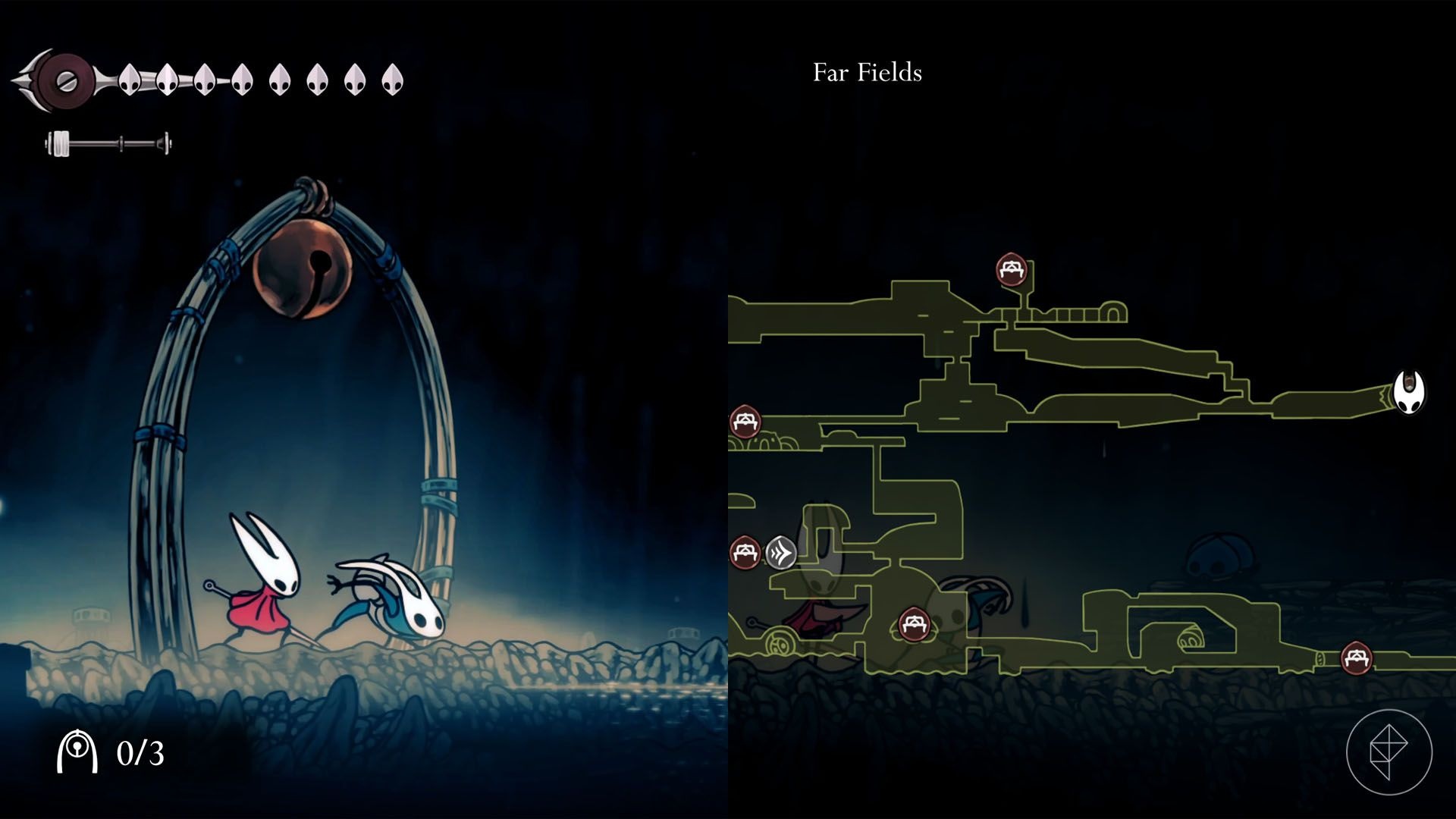 In bottom-right Far Fields there’s an apparently unreachable house with hanging rings. Use Clawline to grapple the rings into the house. The doorway closes behind you; glide down and avoid spikes until you reach an explosive rock that removes the floor, revealing lava and two destructible platforms. Clear a difficult enemy gauntlet using the two platforms and walls, then outrun rising lava to reach the top and collect the shard. Expect repeated attempts — failure sends you back to the start of the sequence.