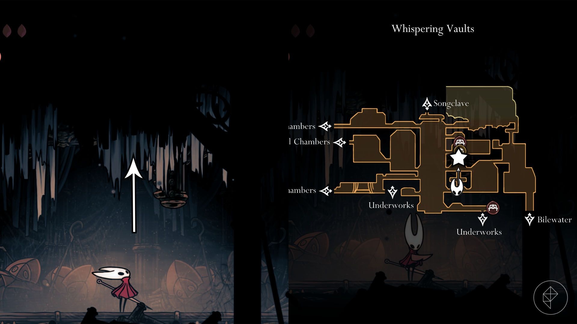 This shard is deep in Bilewater and requires Clawline and Faydown Cloak. From the Bilewater Bellway, take the upper-right exit and enter a tall chamber. Double-jump and zigzag up using Clawline and Faydown; watch for bloatroaches that spit bile and slubberlugs that can drag you into grub-infested water. Continue right through the route until you reach the shard.