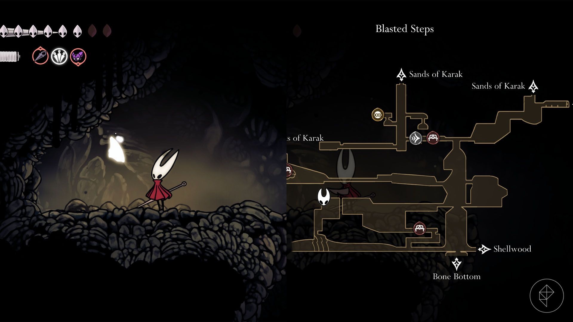 This one needs Clawline and Faydown Cloak. From the bottom-left of Blasted Steps, stand on the final ground stone platform, then sprint-jump left, use Clawline midair and double-jump with Faydown Cloak to reach higher platforms. Repeat similar moves upward, traverse a room with wall-climbing bugs, falling rocks and spikes, and collect the shard in the top-left corner.