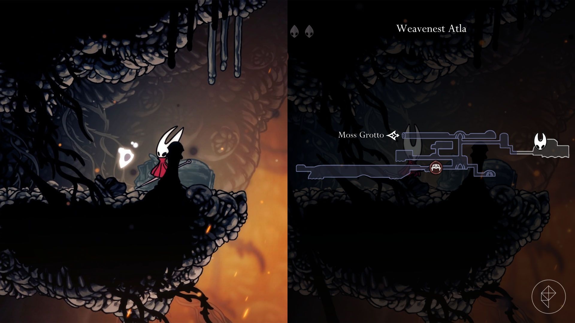 After unlocking the Needolin, return to the bottom-right of Moss Grotto, play the Needolin to open a weaver door, then power up Weavenest Alta by hitting two silk spools. Use Cling Grip and climb the shaft to enter a secret area; complete a lava-and-pogo challenge to reach the shard in the top-left corner.