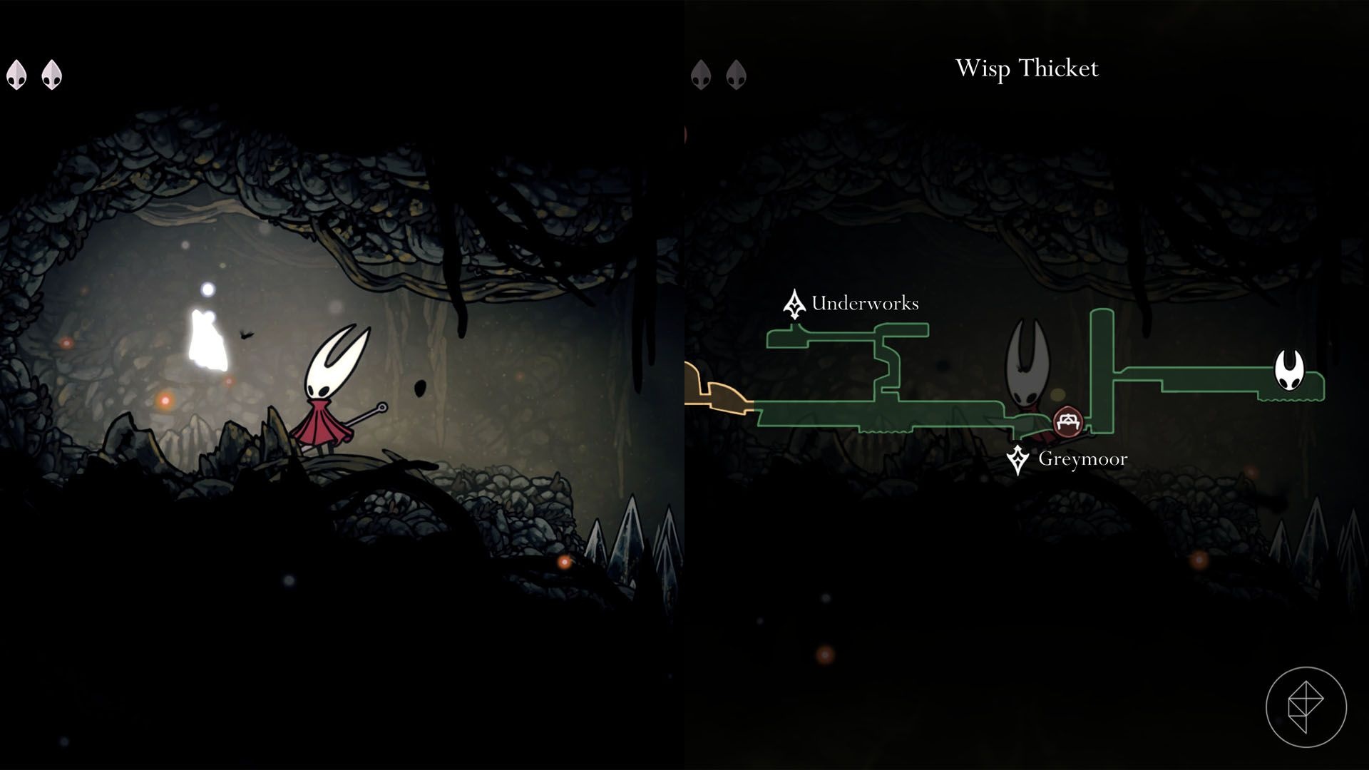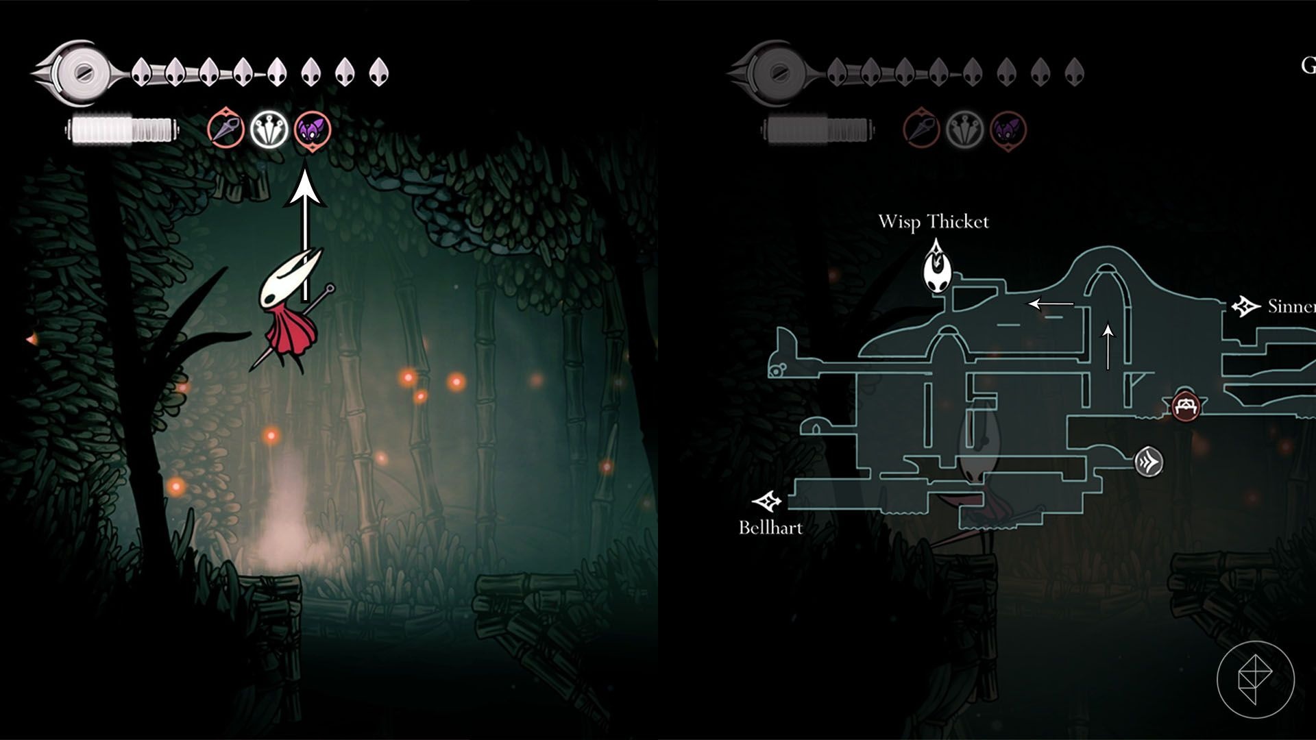 Unlock Faydown Cloak first, then enter Wisp Thicket (entrance in top-left Greymoor). After entering, head right, break a hanging sac to drop a bench and rest, then use pogo on hanging red balloons and Clawline to climb. Take the first right exit while climbing, ignore or run past fire-spewing enemies, and clear a final Clawline-and-pogo section to reach the shard.