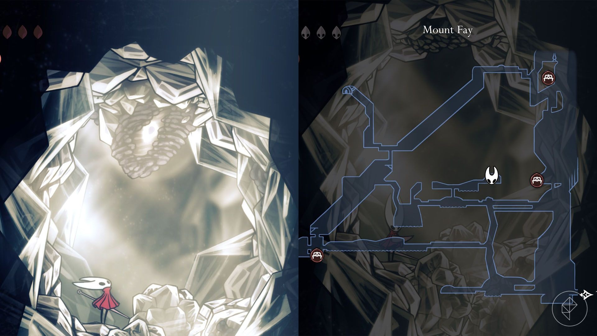 In Act 3, use Silk Soar from Hunter’s March to access a secret area at Mount Fay. Climb to the center hallway, use Clawline on flying crystal bugs to land on a small platform in water, Silk Soar up a ceiling hole, break ice to reach a bottom-right area, then Silk Soar again to a hidden cave. There, use Clawline on large mnemonords and stand on ice crystals for boosts to reach the top and collect the shard.