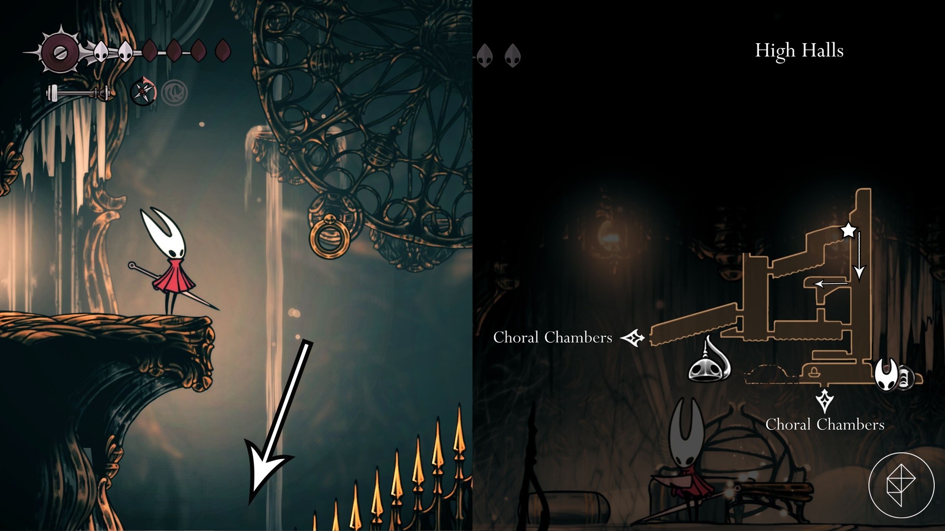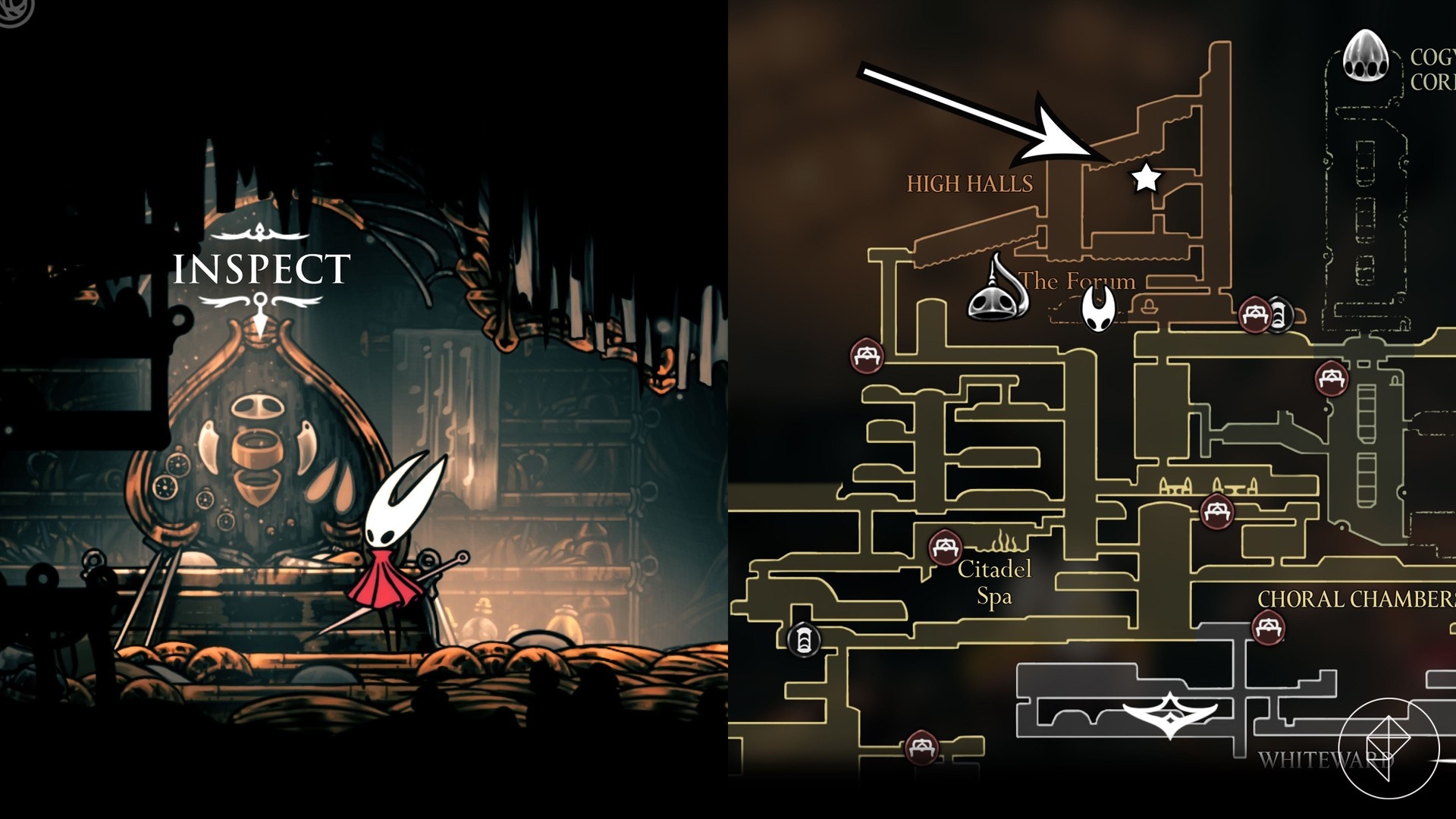 In the appropriate High Halls chamber, glide down (avoid spikes) and take the left exit when possible. At the end of that chamber, interact with the board and select “construct tool” to craft the Cogfly tool once you have Craftmetal.