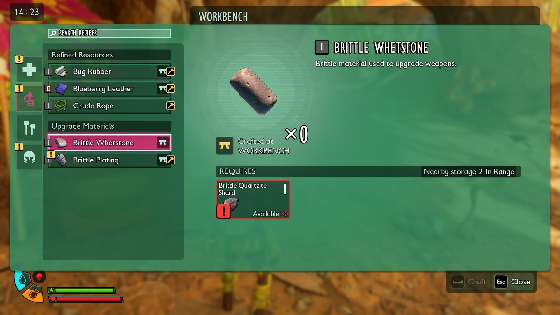 Once you have brittle quartzite chunks, go to any nearby workbench. Then, open the Resources tab and craft a brittle whetstone. It takes one chunk of brittle quartzite to make one whetstone. If you harvest the nodes listed above, you can craft multiple whetstones; for example, harvesting the nodes we named yields enough material to make up to six brittle whetstones.