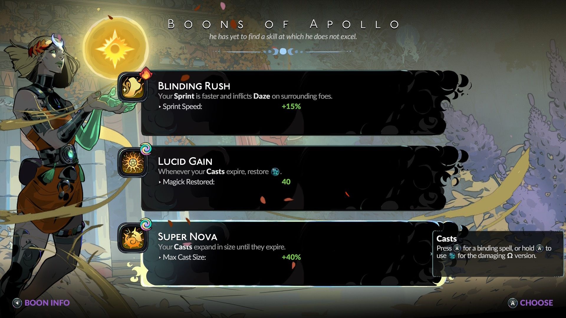 Boons return and are tied to gods. For example, Hestia grants fire effects, Aphrodite applies weakening effects, Apollo offers daze effects, Zeus delivers lightning effects, and Selene can unlock a randomized power that scales as the player uses witchy powers. Combining boons with weapon builds remains a central gameplay loop.