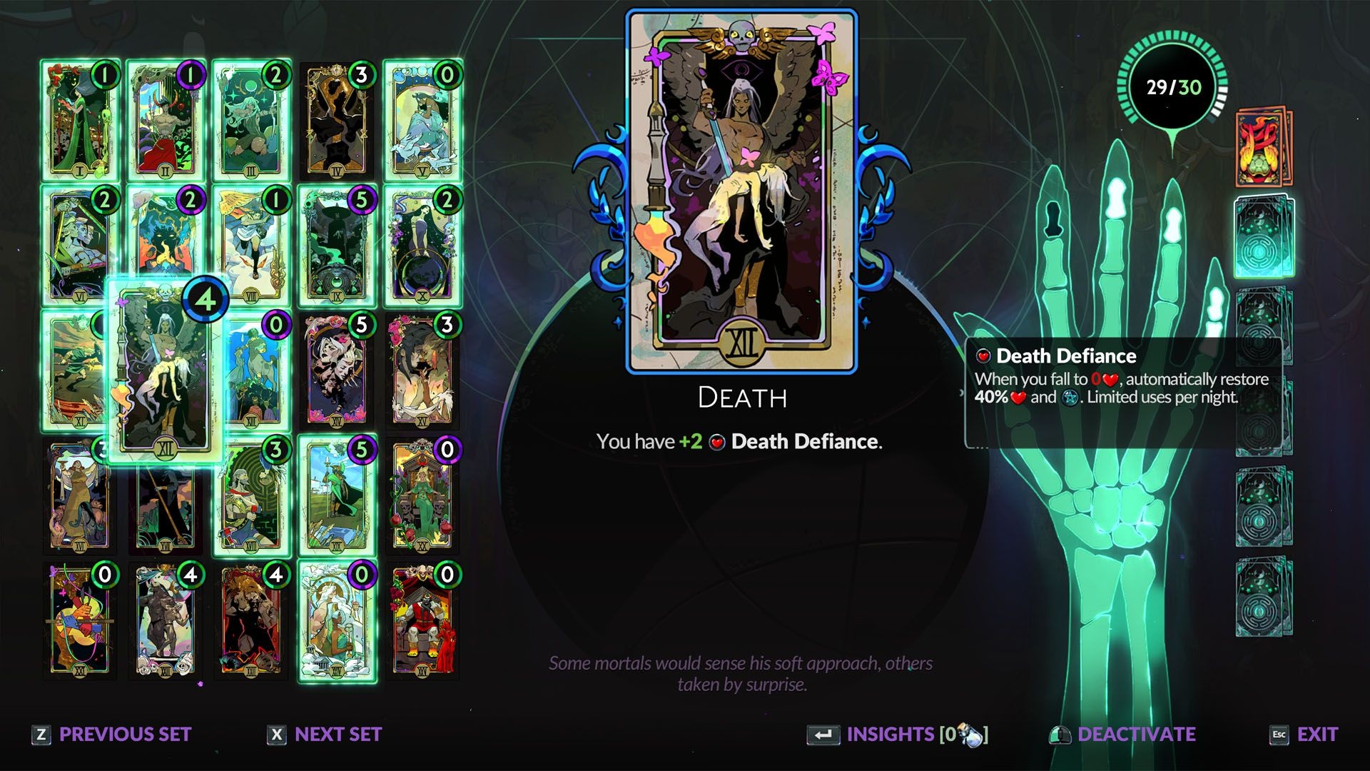 | XII | Death | You have +1 Death Defiance. | 4 | 35 Ash |