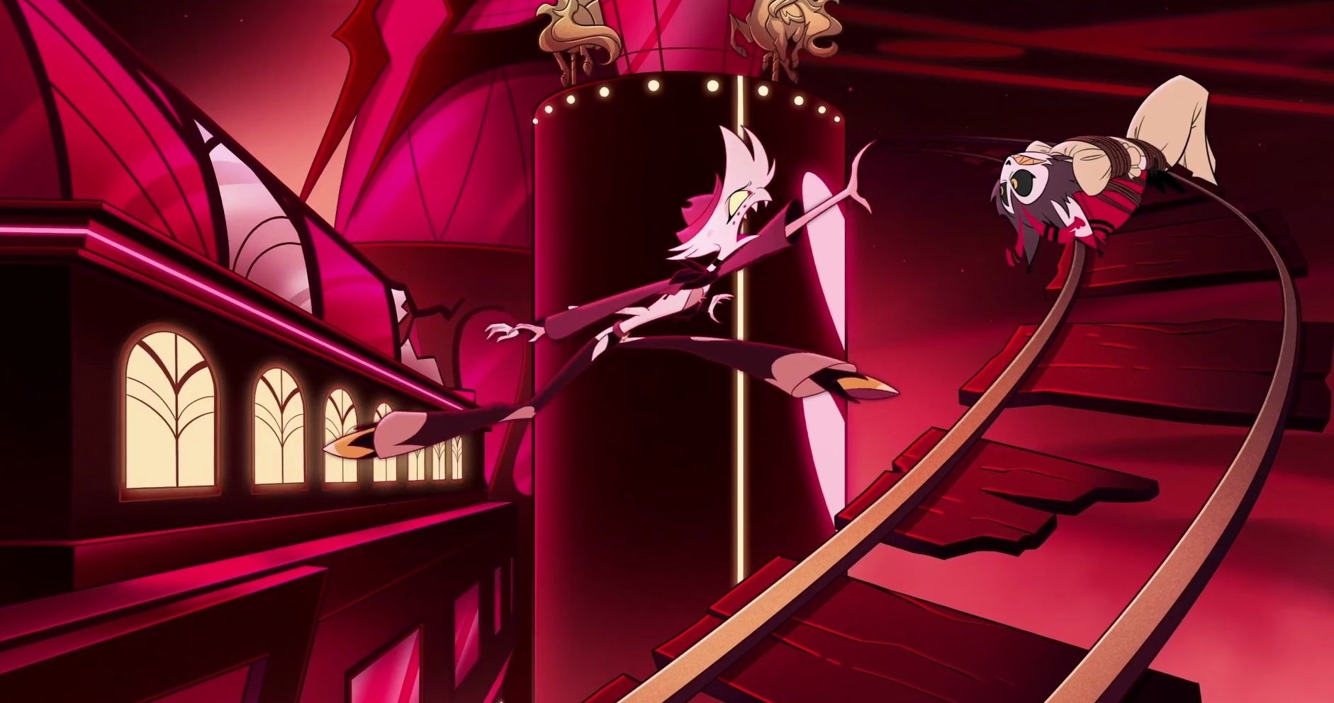 The teaser flashes a moment that’s already caught fans’ eyes: Angel Dust leaping off a building toward Husker, who appears to be tied to a stylized train track. That imagery looks almost Seussian, and it raises questions about whether the scene is a dream, a musical sequence, or an actual event in the story.